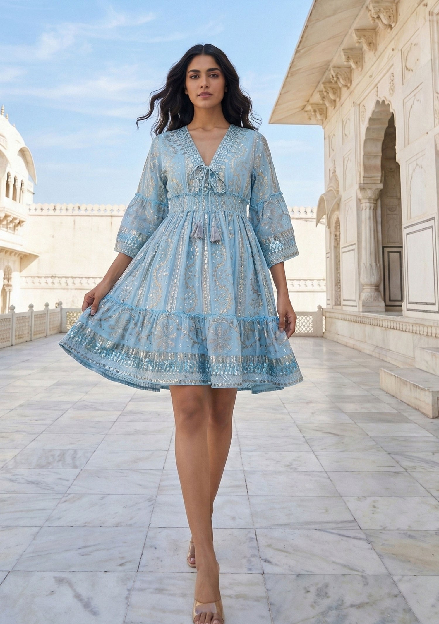 His stunning short dress is a perfect blend of elegance and comfort, featuring a beautiful mint green color adorned with intricate floral patterns. The dress boasts a flowing silhouette that drapes gracefully, accentuated by a flattering V-neckline and wide, billowy sleeves. Delicate embroidery and shimmering sequins add a touch of sparkle, making this dress ideal for both daytime outings and evening events.