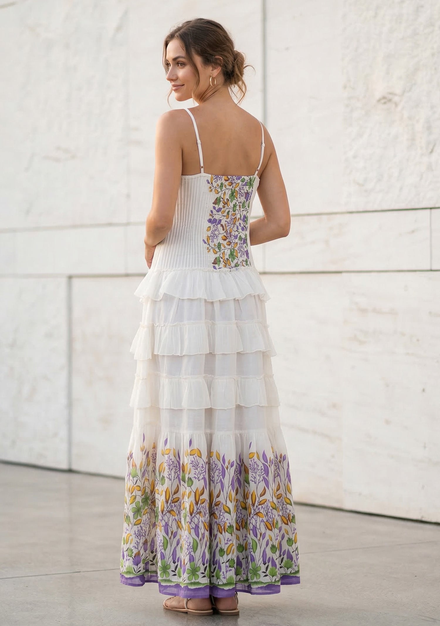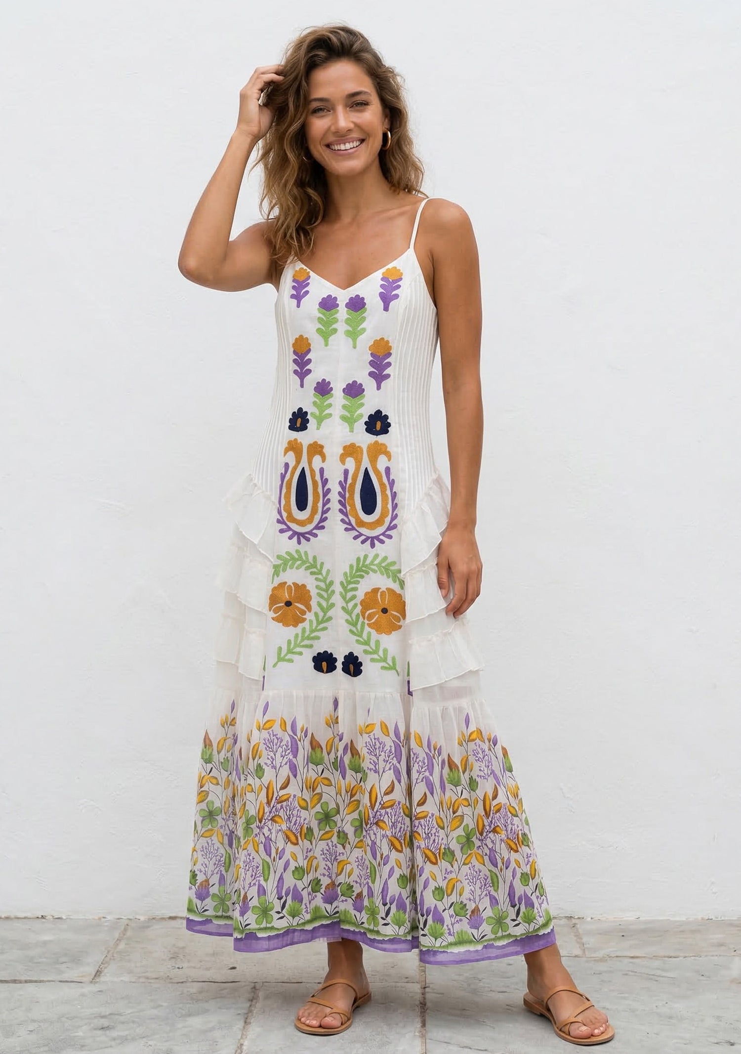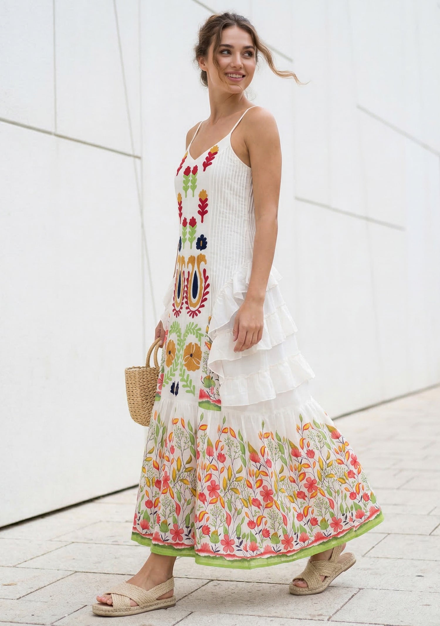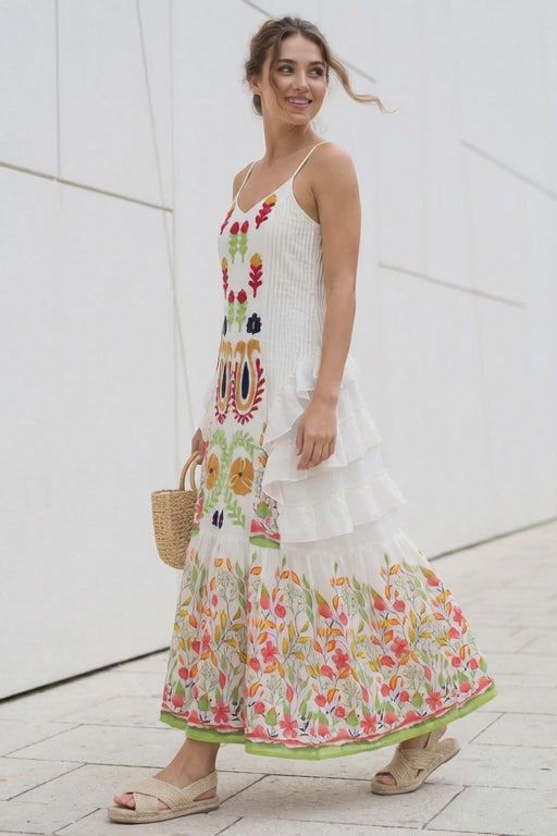 The breathable cotton fabric ensures comfort, while the detailed embroidery enhances the elegance of the design. Perfect for vacations, casual outings, or summer events.