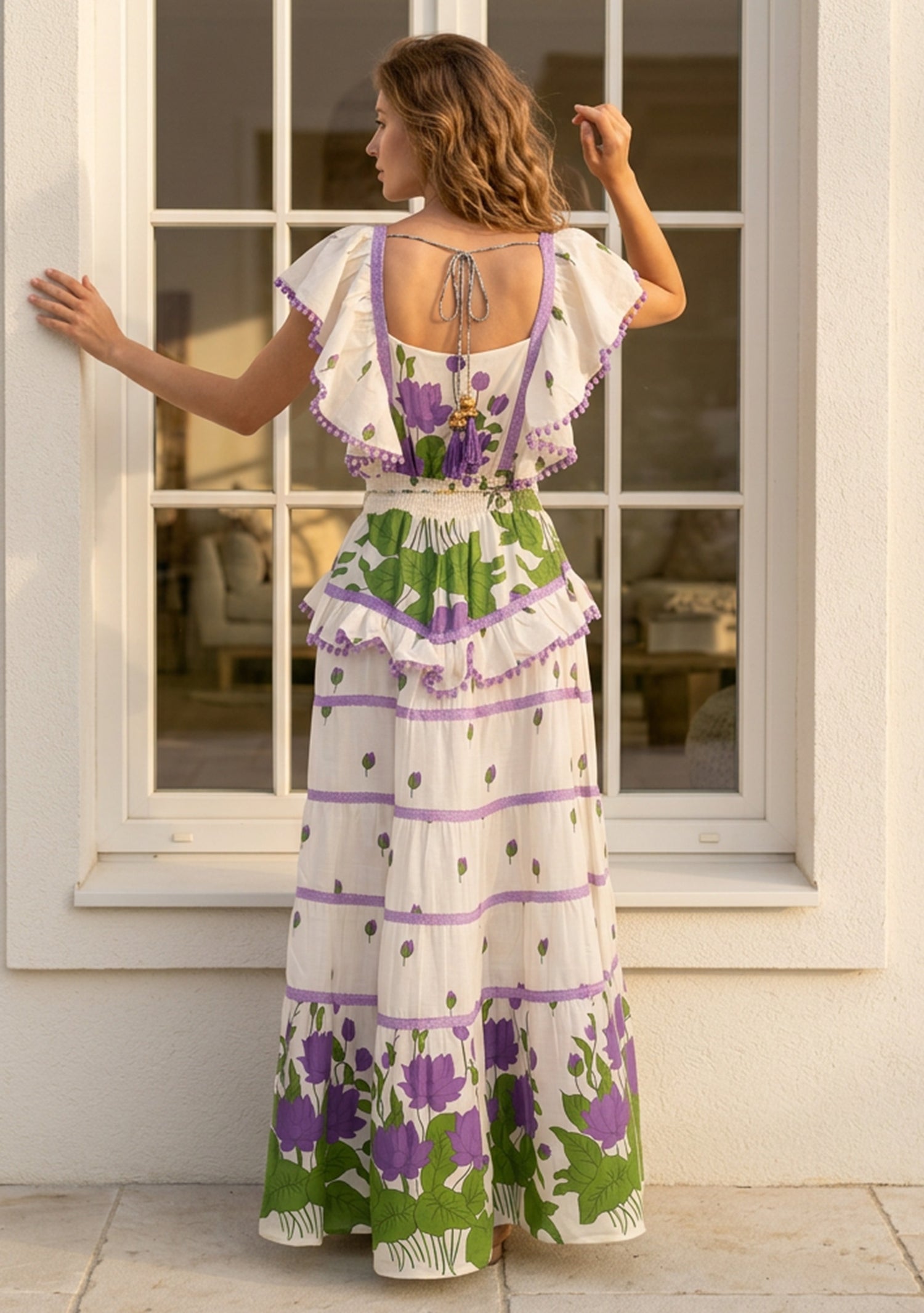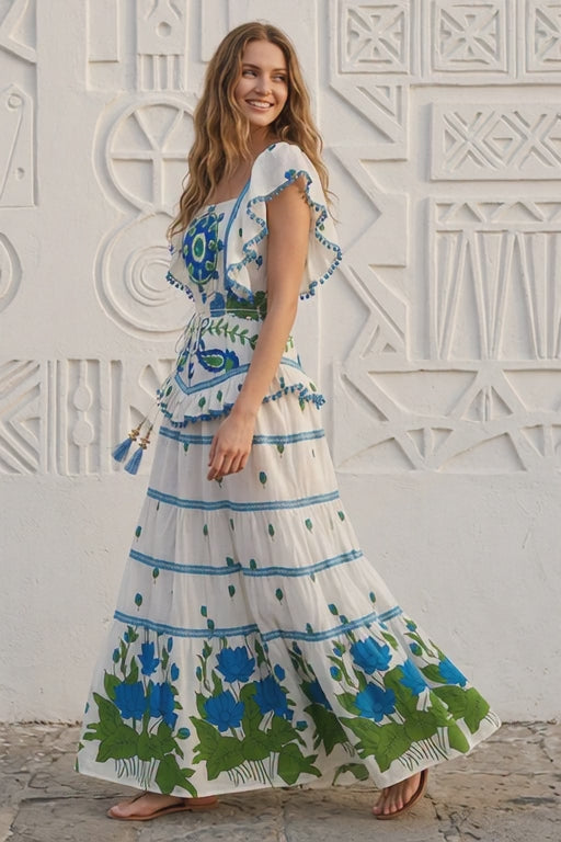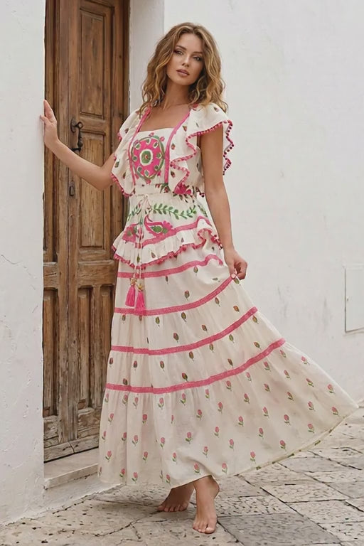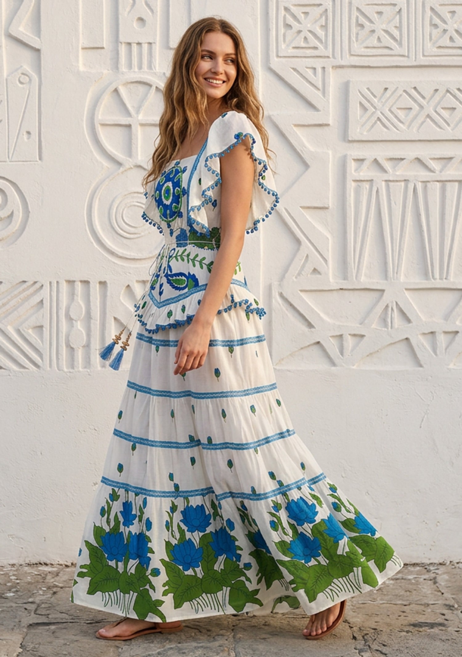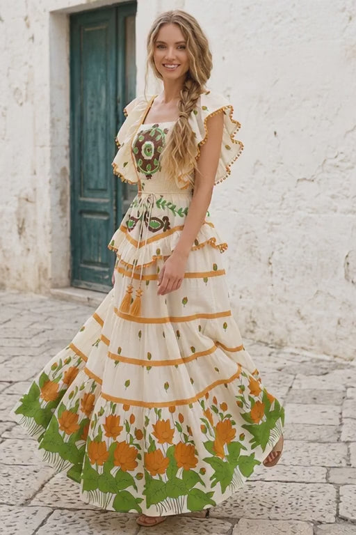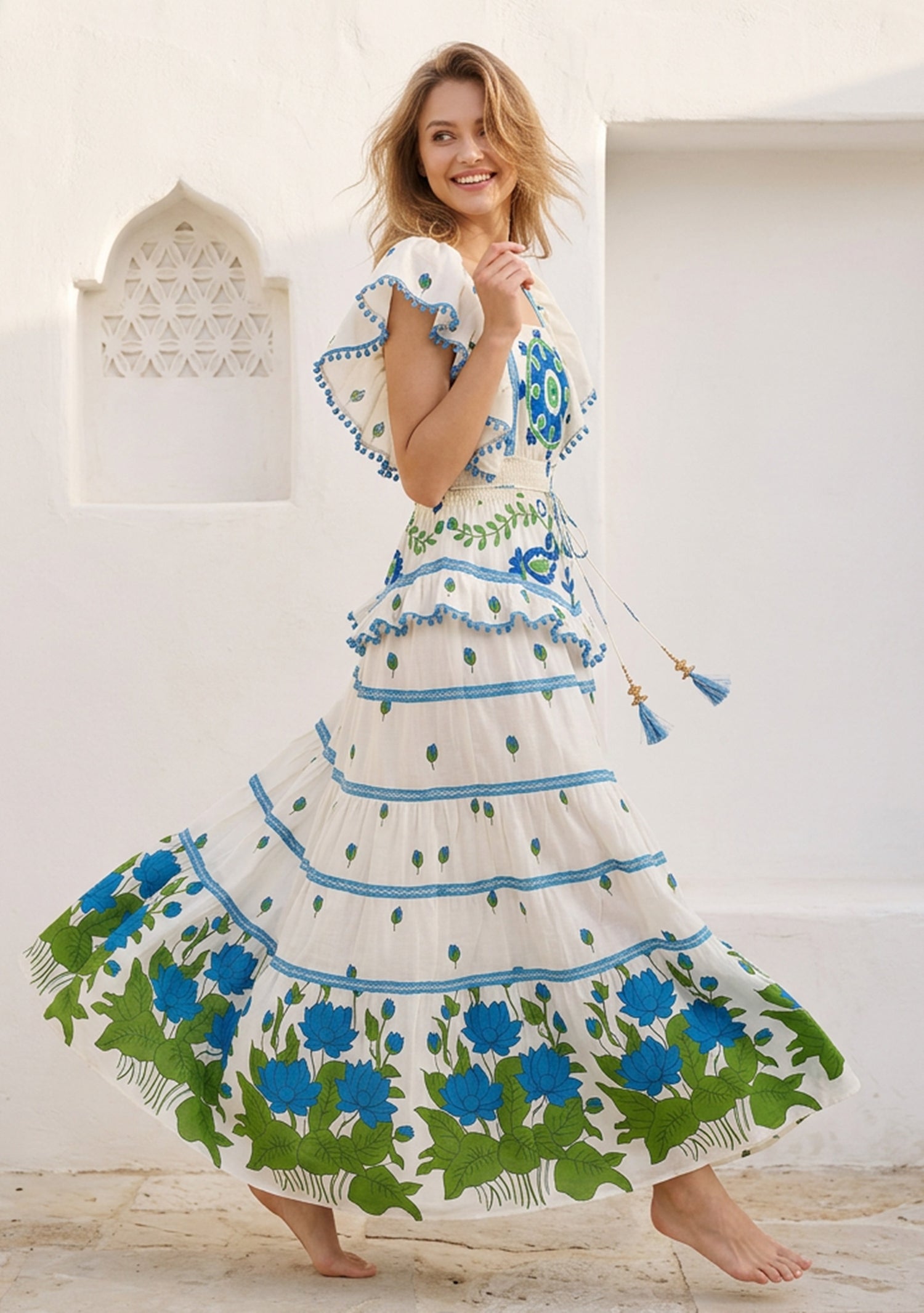 This beautiful cotton long dress features vibrant floral embroidery and a relaxed bohemian silhouette. Crafted from breathable cotton fabric, the dress offers comfort while showcasing artistic hand embroidery. The tiered skirt and decorative detailing make it a perfect choice for summer outings, vacations, and casual events.