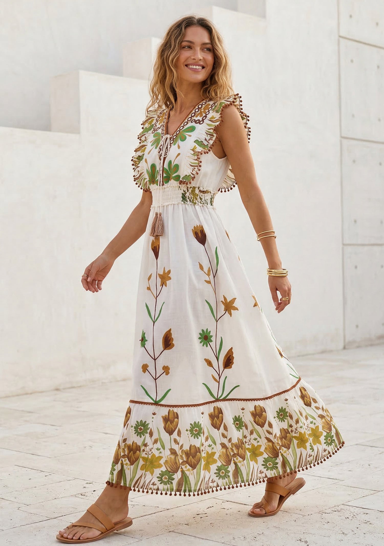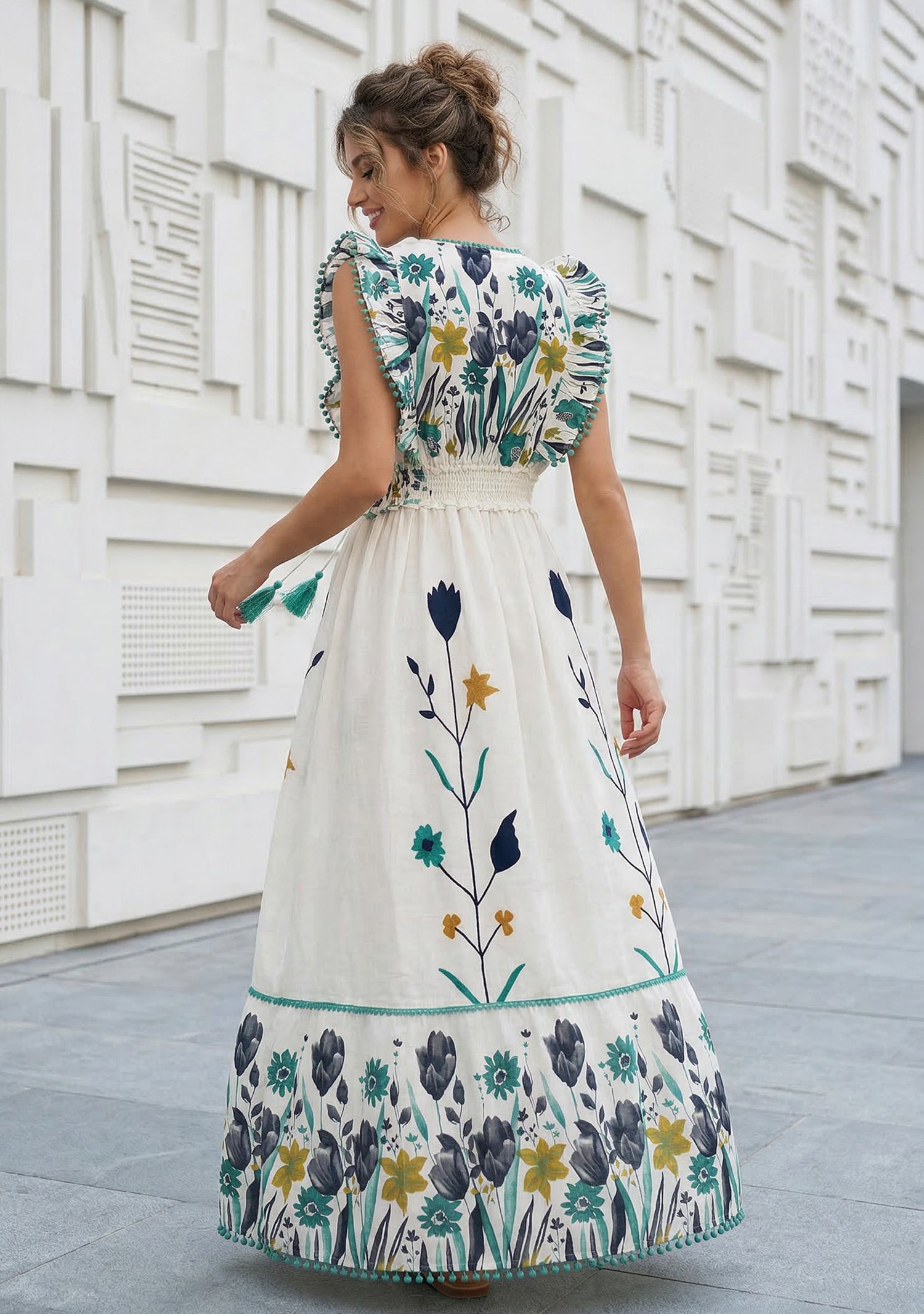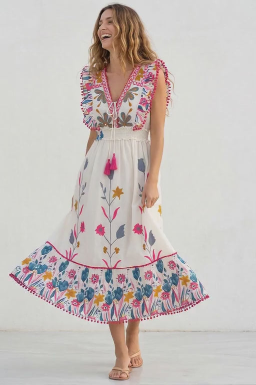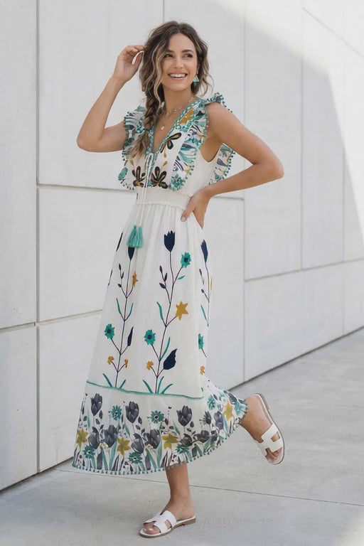 This beautiful cotton long dress features vibrant floral hand embroidery and a relaxed bohemian silhouette. Crafted from breathable cotton fabric, the dress offers comfort and effortless style. The colorful embroidered patterns and elegant tiered hem create a charming summer-ready look perfect for vacations, casual outings, or resort wear.