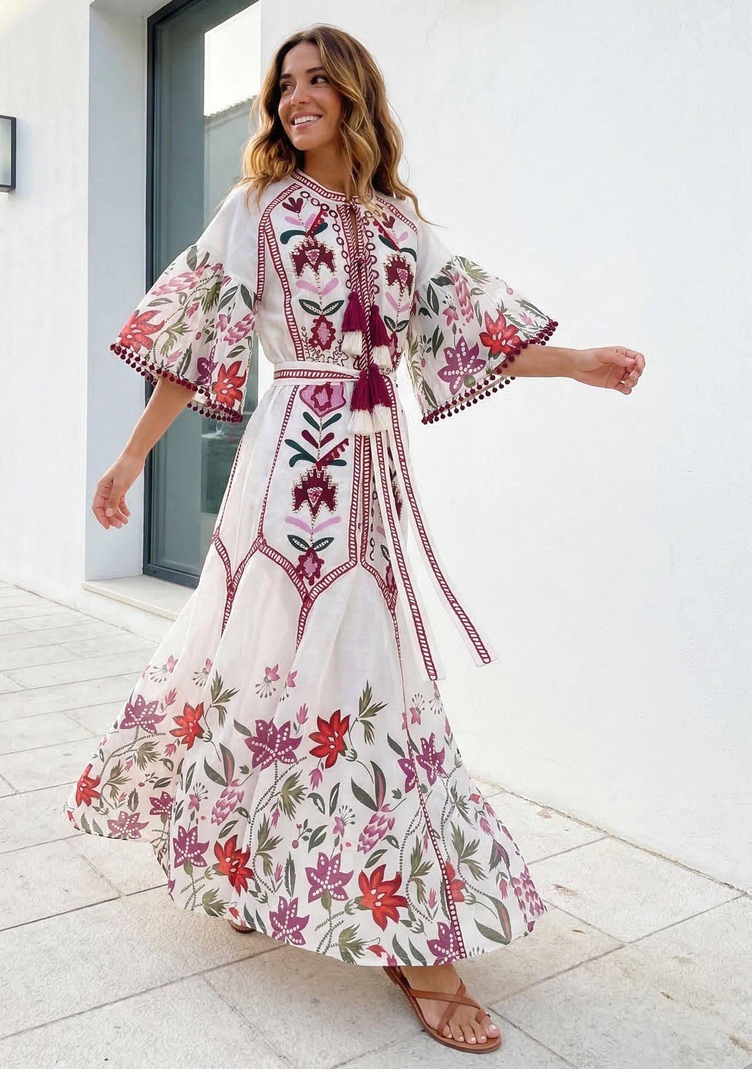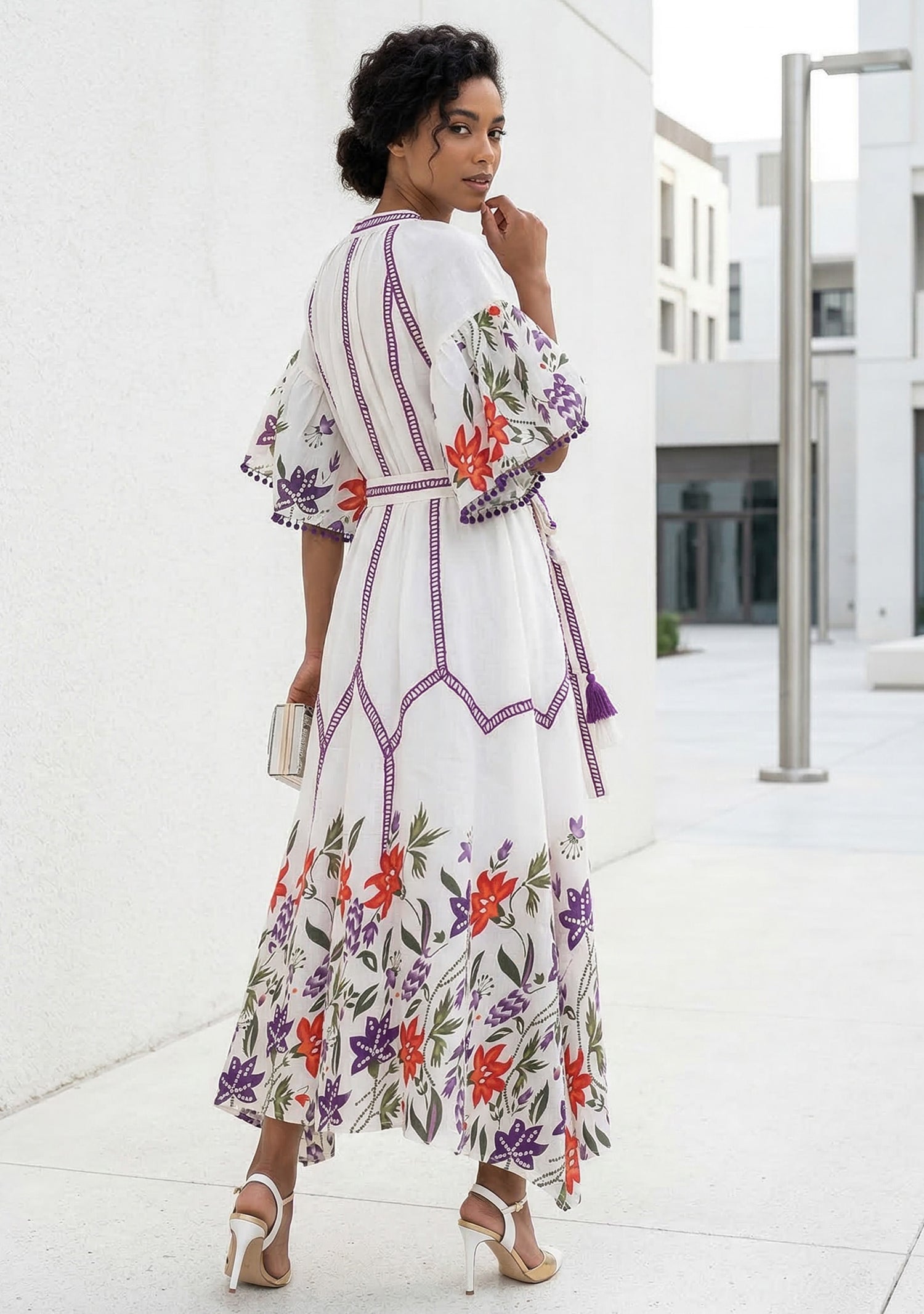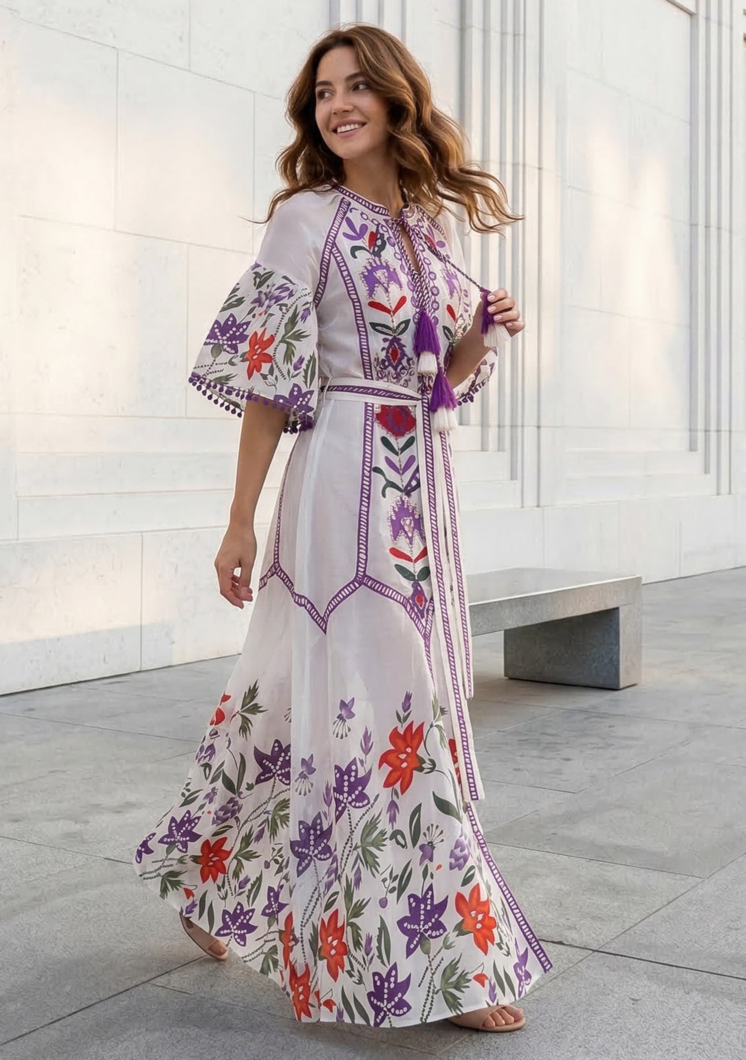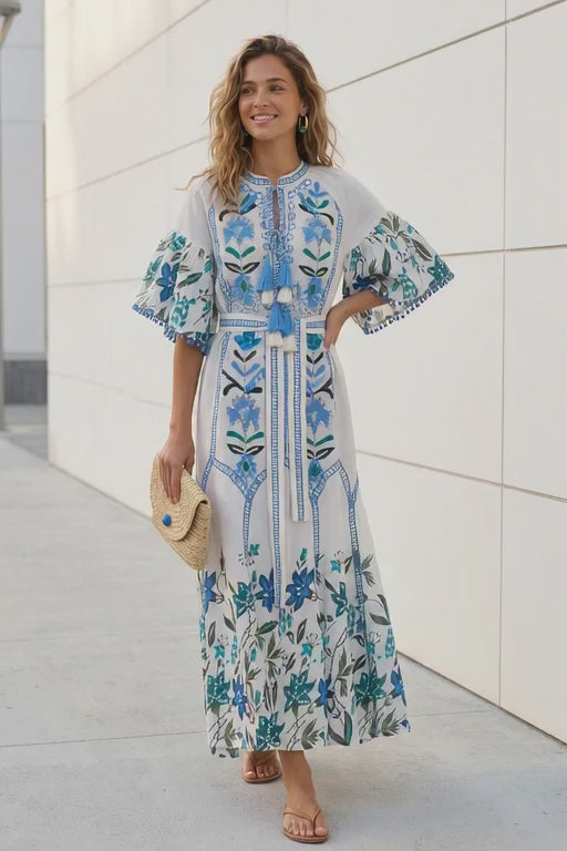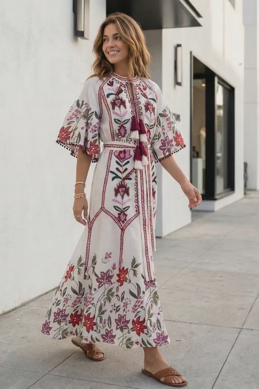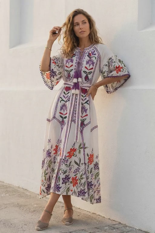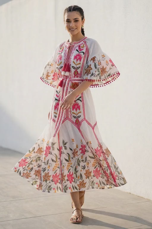Inspired by artisan craftsmanship, this cotton maxi dress combines detailed hand embroidery with vibrant floral patterns. The lightweight cotton fabric ensures breathability and comfort, while the relaxed silhouette creates an elegant bohemian look ideal for summer styling.