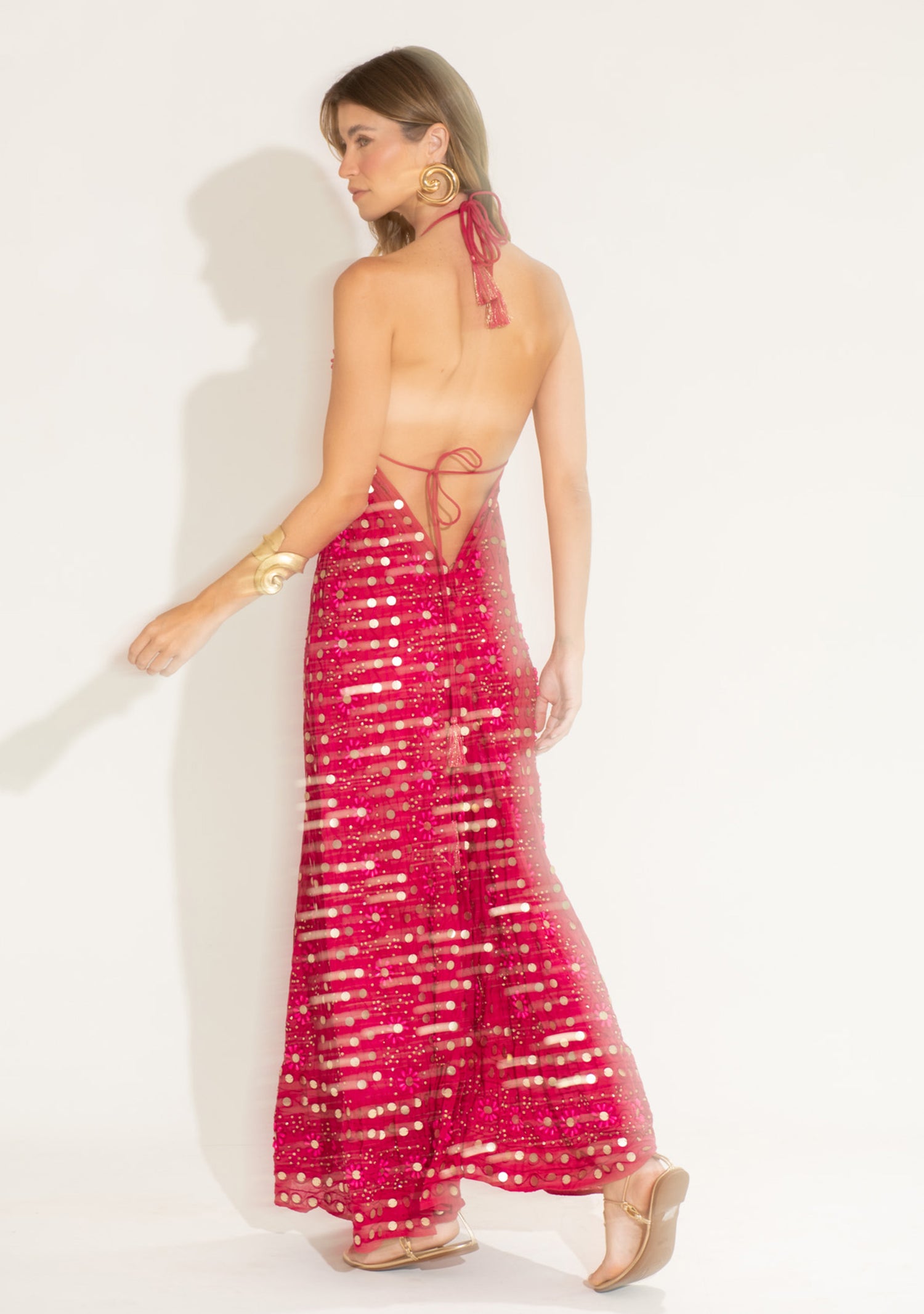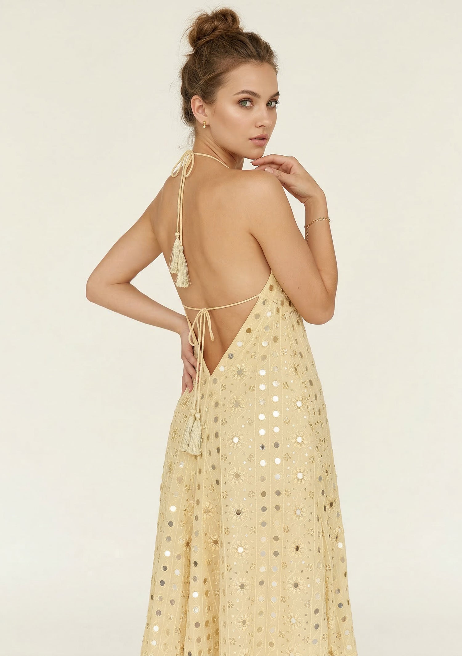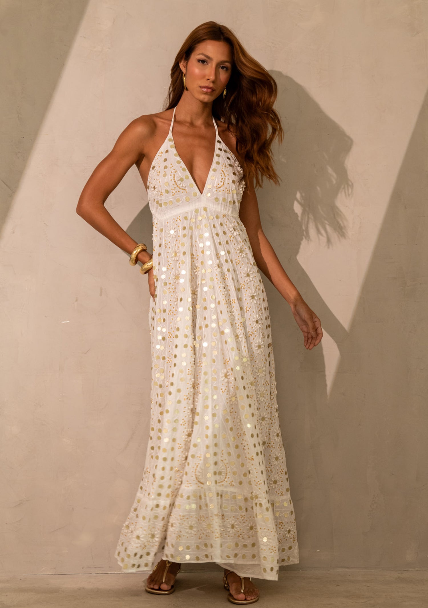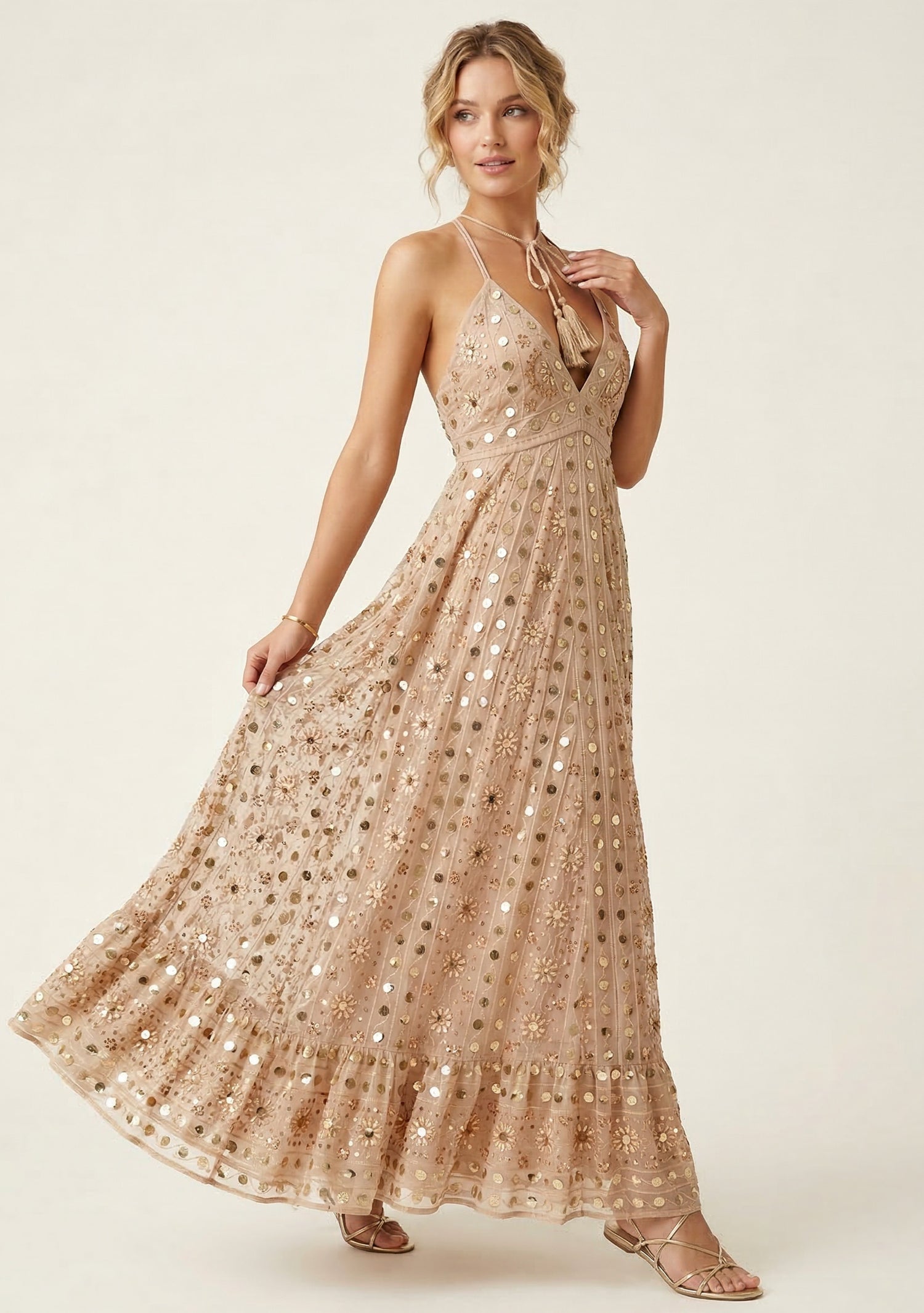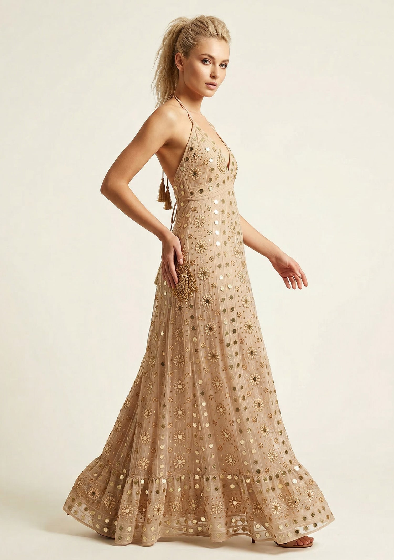 This stunning evening maxi dress features intricate hand embroidery decorated with shimmering beads and embellishments that create a luxurious statement look. The flowing silhouette and elegant halter neckline enhance the feminine shape, while the handcrafted detailing adds a touch of artisanal craftsmanship.