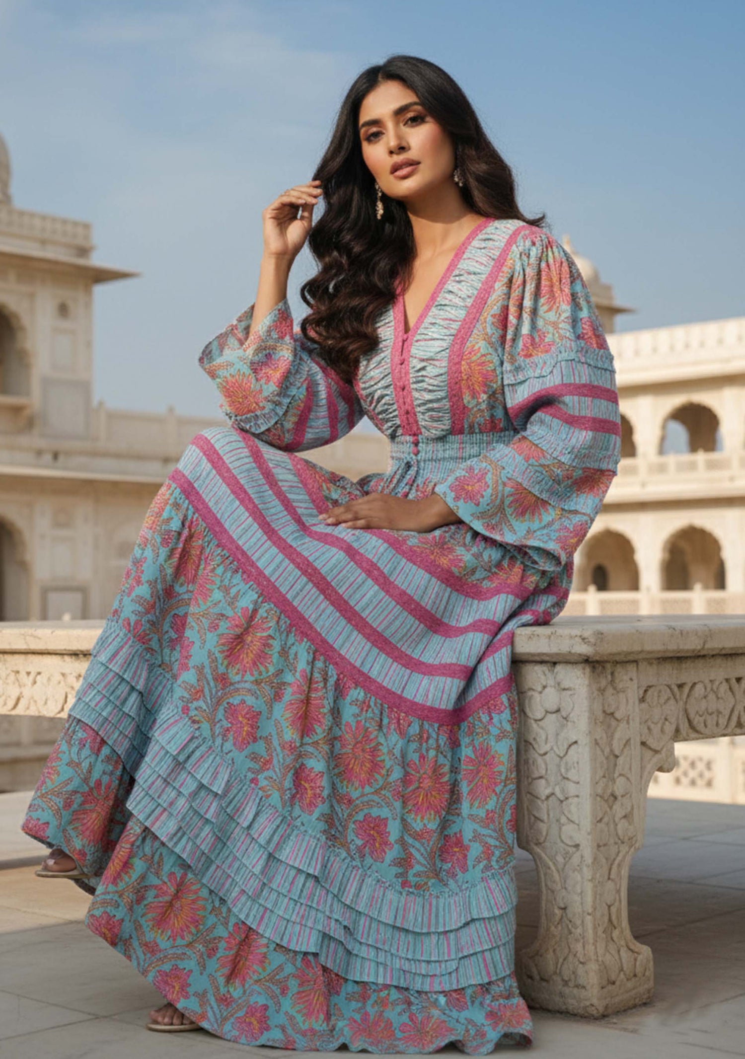 Featuring a flattering V-neckline with delicate lace trimming, handcrafted fabric buttons, and a drawstring tie with tassels at the waist, this dress is both versatile and refined. The long, tiered silhouette with soft gathers and pleated layers adds graceful movement to every step