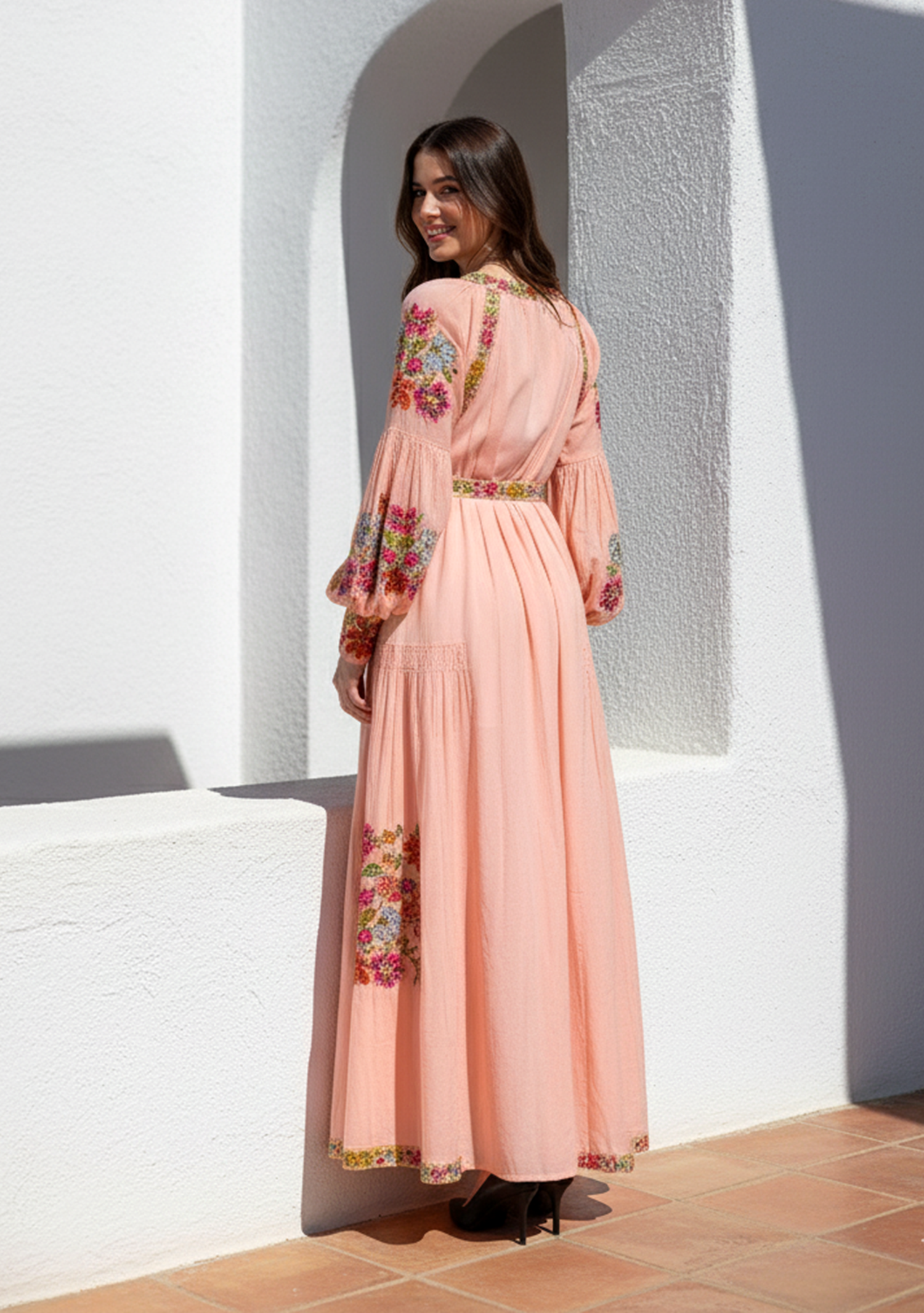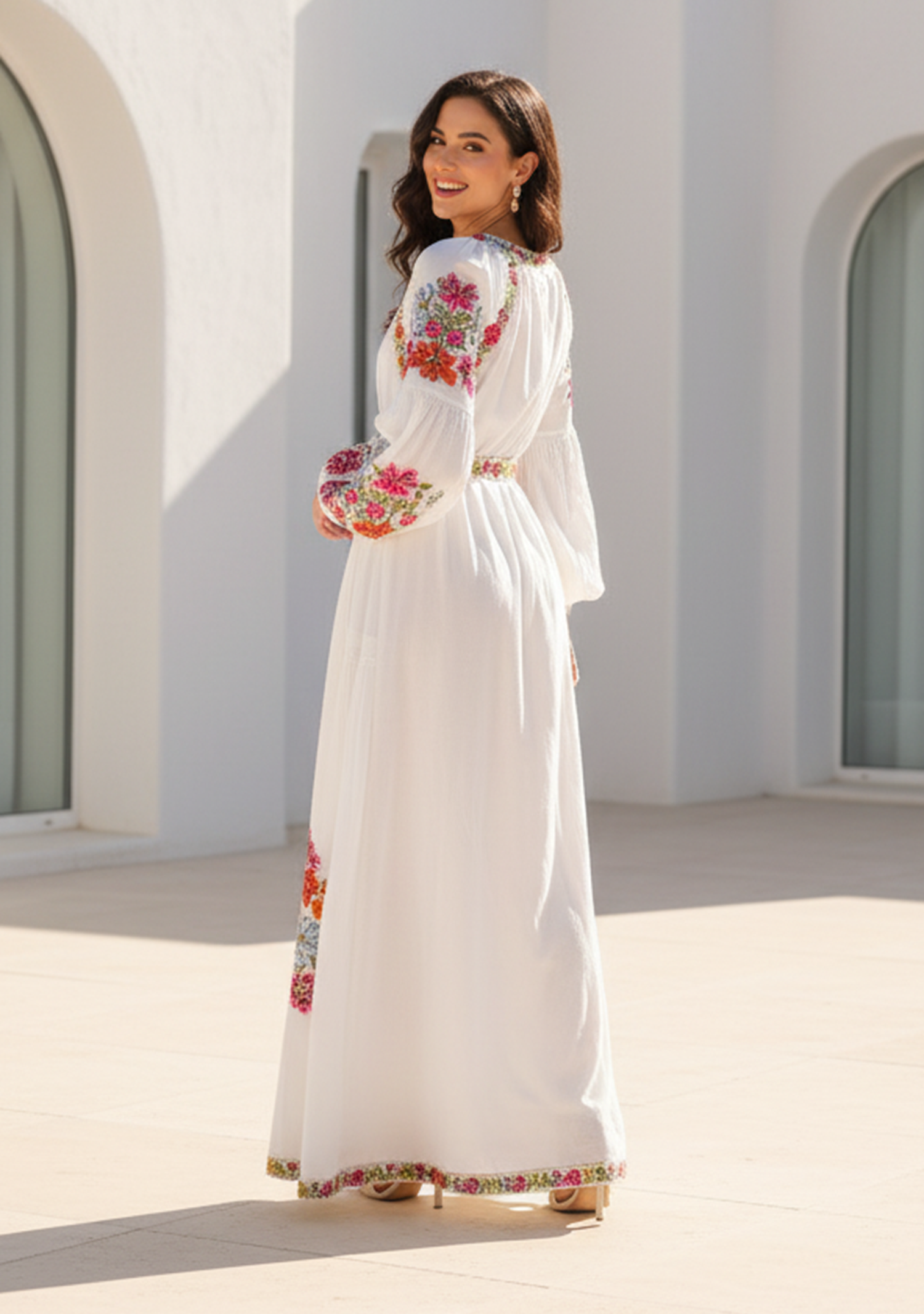 Inspired by bohemian elegance, this long maxi dress showcases beautiful hand embroidery accented with sparkling beads. The flowing silhouette and artistic floral patterns create a stylish yet relaxed look, making it ideal for resort wear, vacations, or elegant daytime occasions.