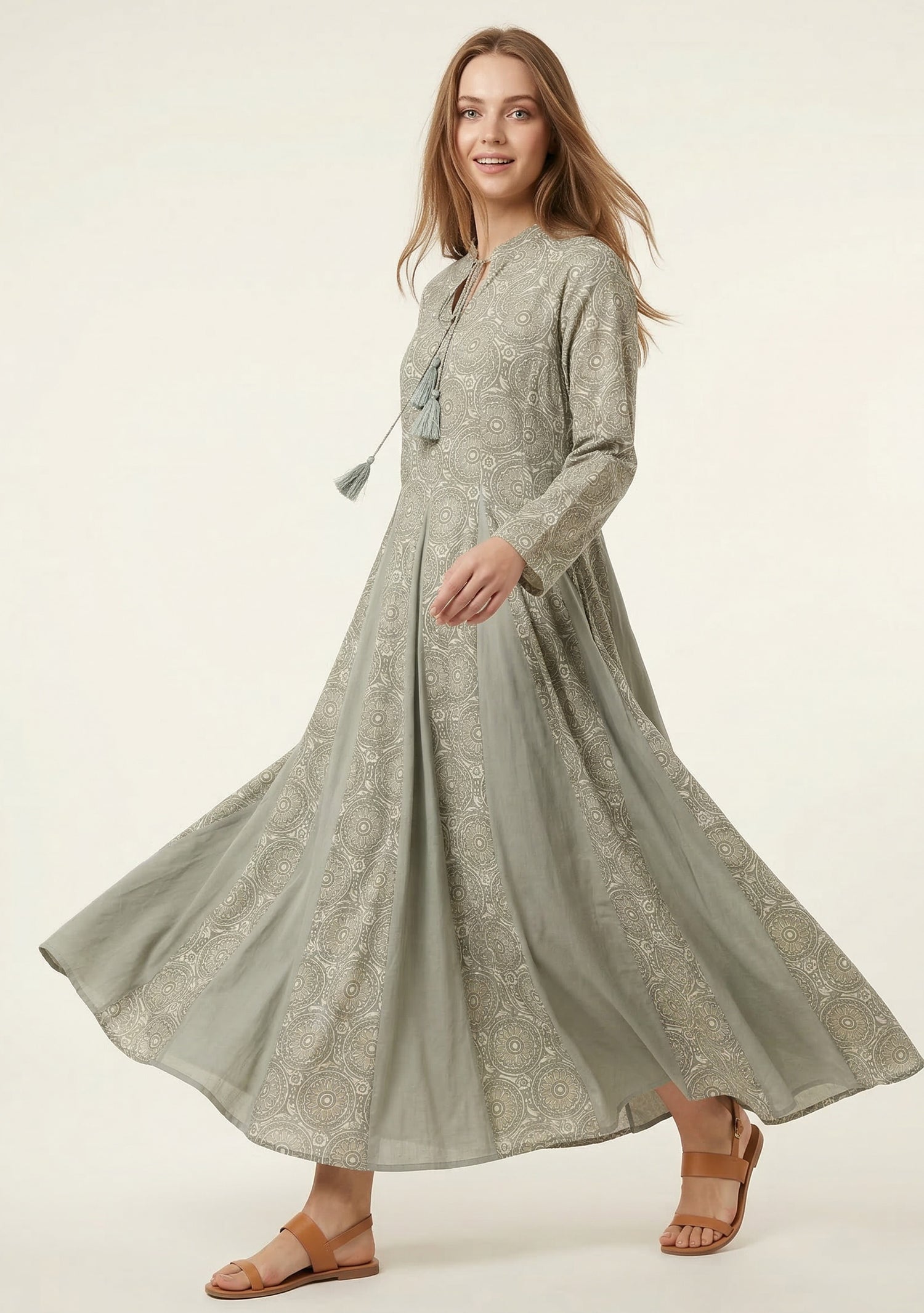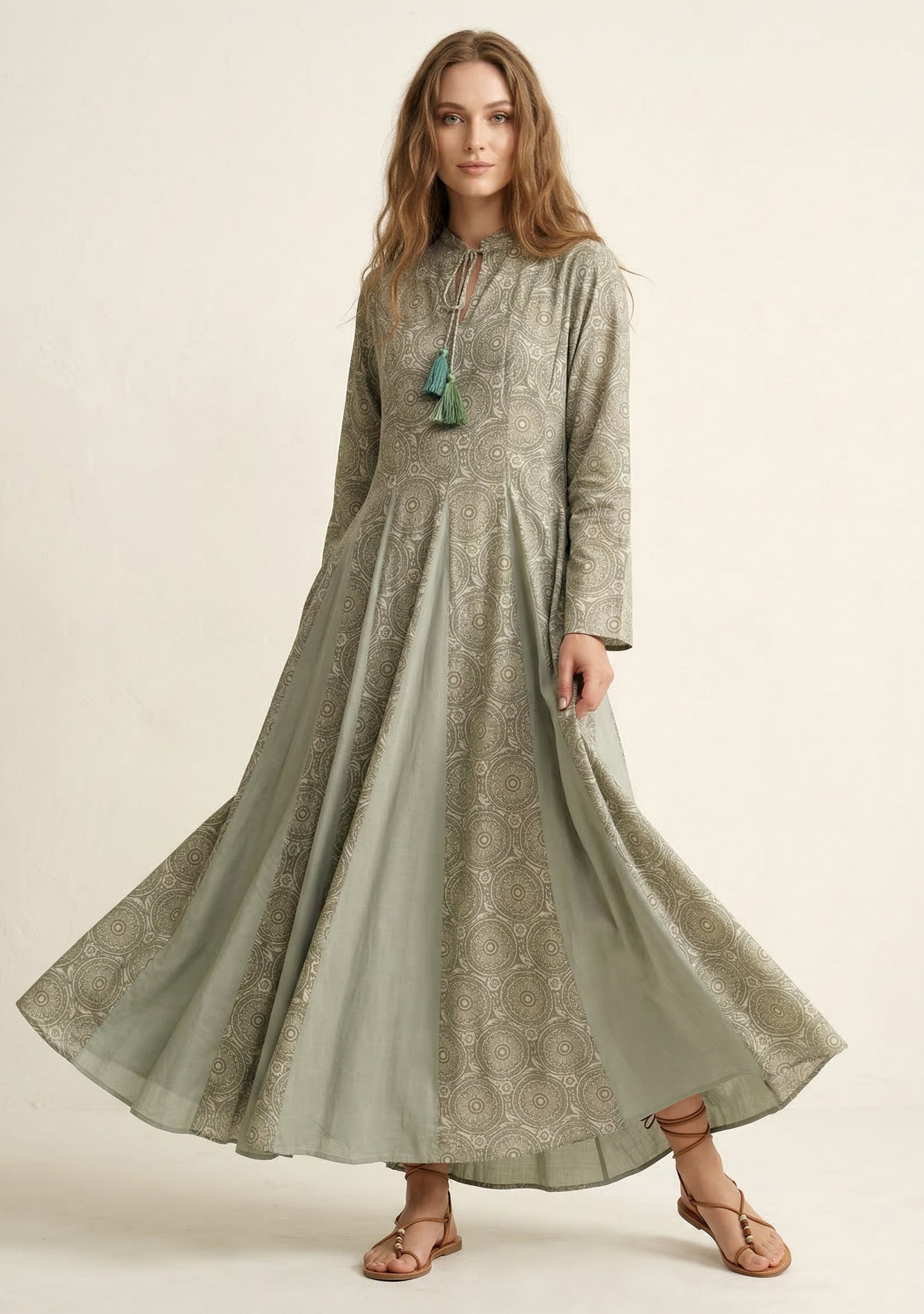 Crafted from breathable cotton fabric, this long dress features a flowing silhouette with soft pleats that add a graceful fall. The vibrant yet soothing prints come in four versatile shades, making it perfect for casual outings, festive gatherings, or everyday wear.