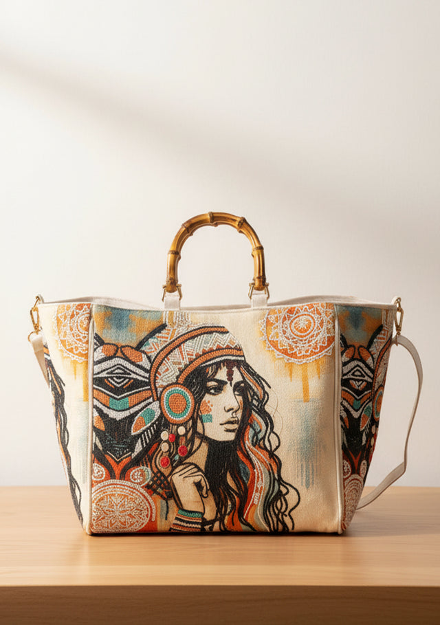 Turn heads with this exquisite Premium Heavy Hand-Embroidered Tote Bag, beautifully crafted with an artistic portrait motif and rich thread detailing. Designed on an elegant ivory canvas base, the bag features intricate hand embroidery, textured accents, and stylish bamboo handles.