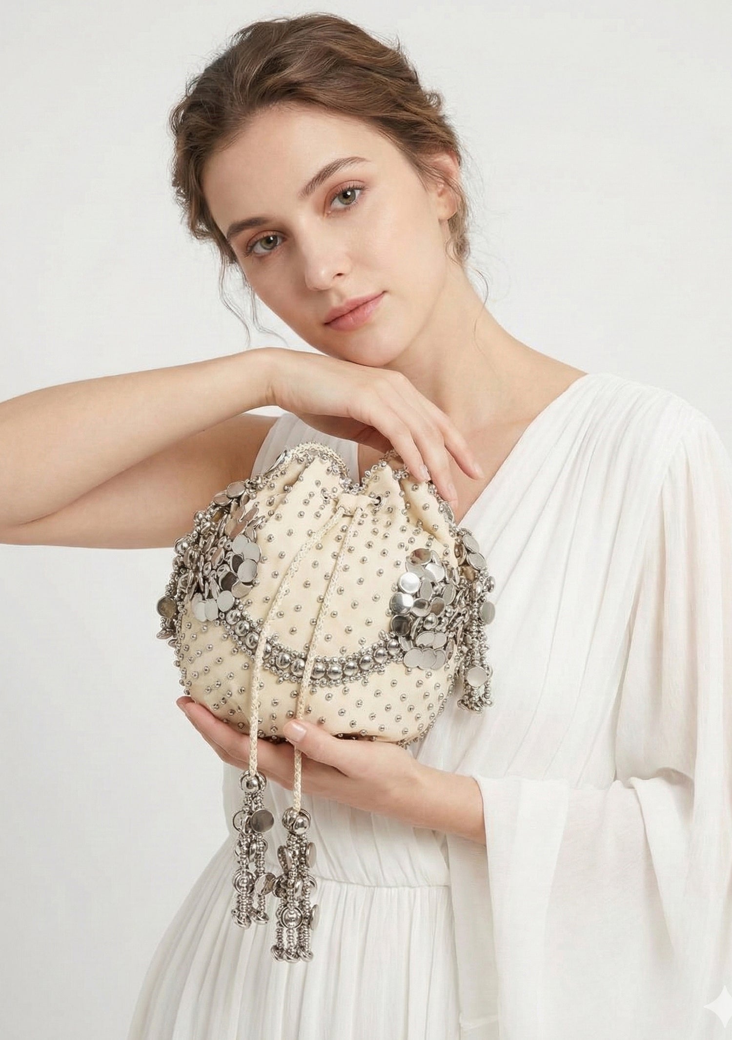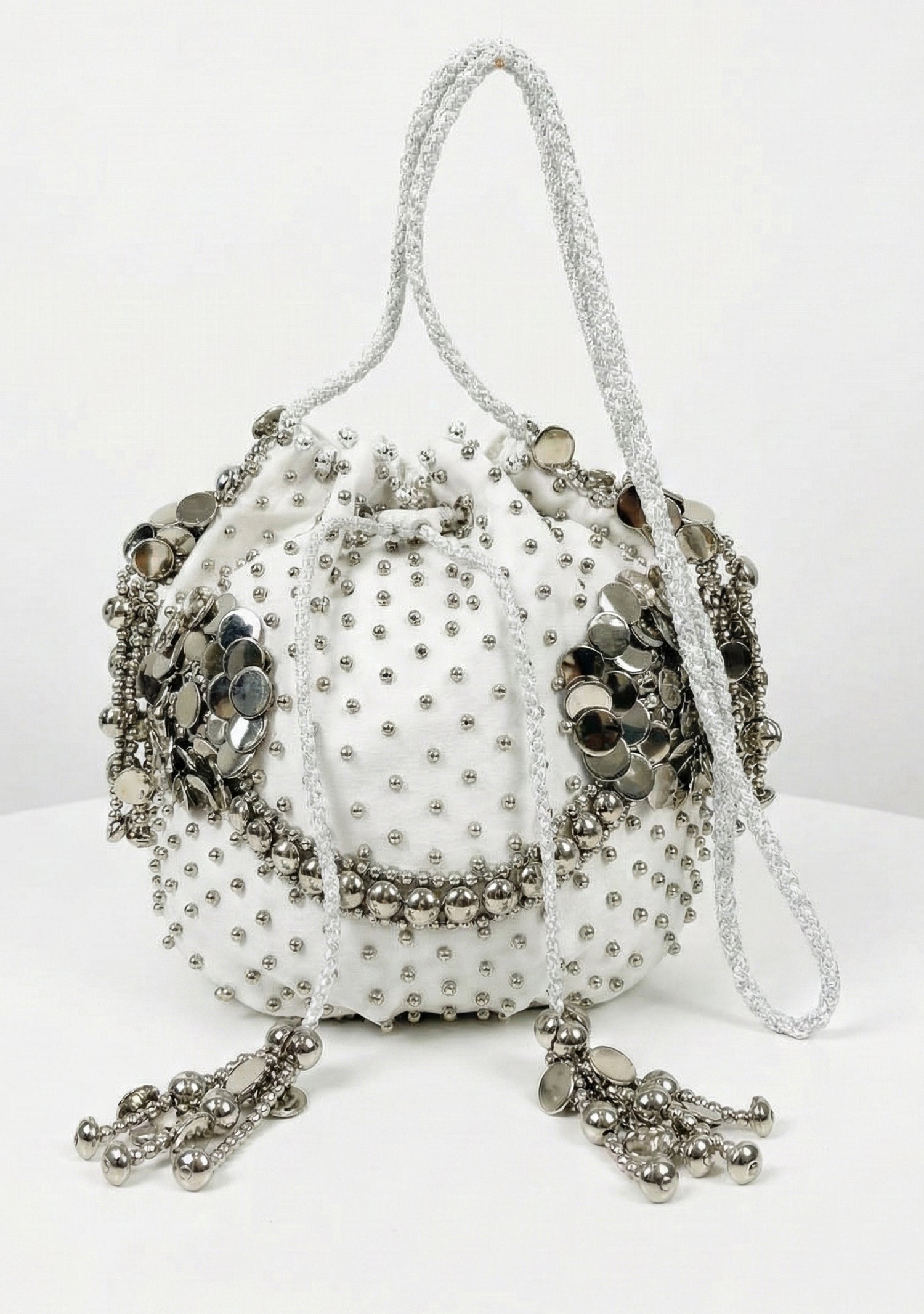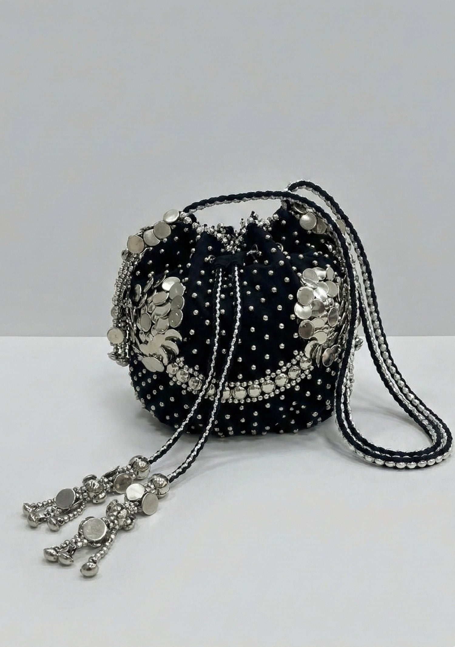 Add a touch of modern elegance to your festive and evening looks with this beautifully handcrafted denim potli bag. Designed in a soft powder-blue hue, the bag is richly adorned with metallic beads, mirror accents, and silver-tone embellishments that create a luxurious, statement-making texture.