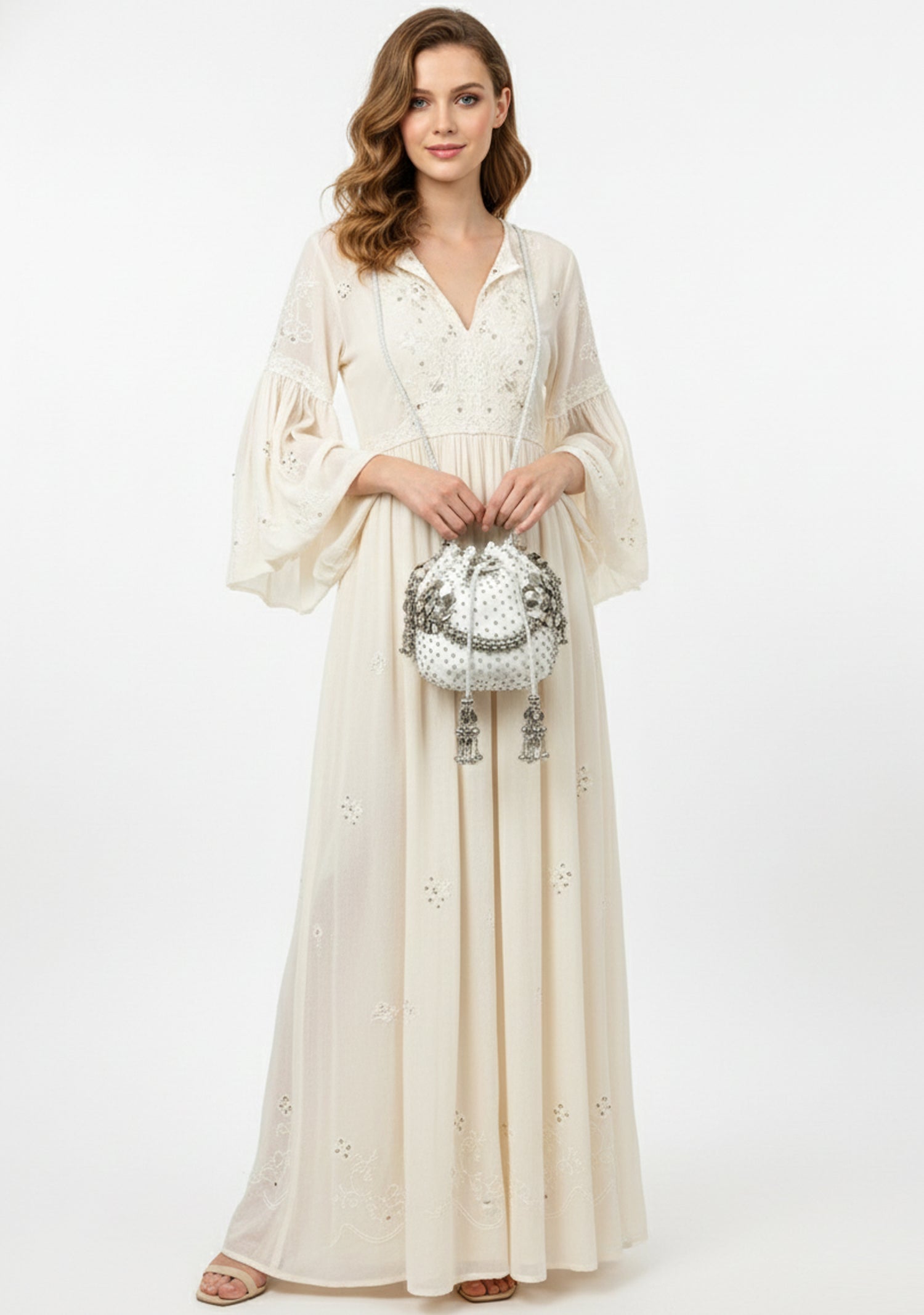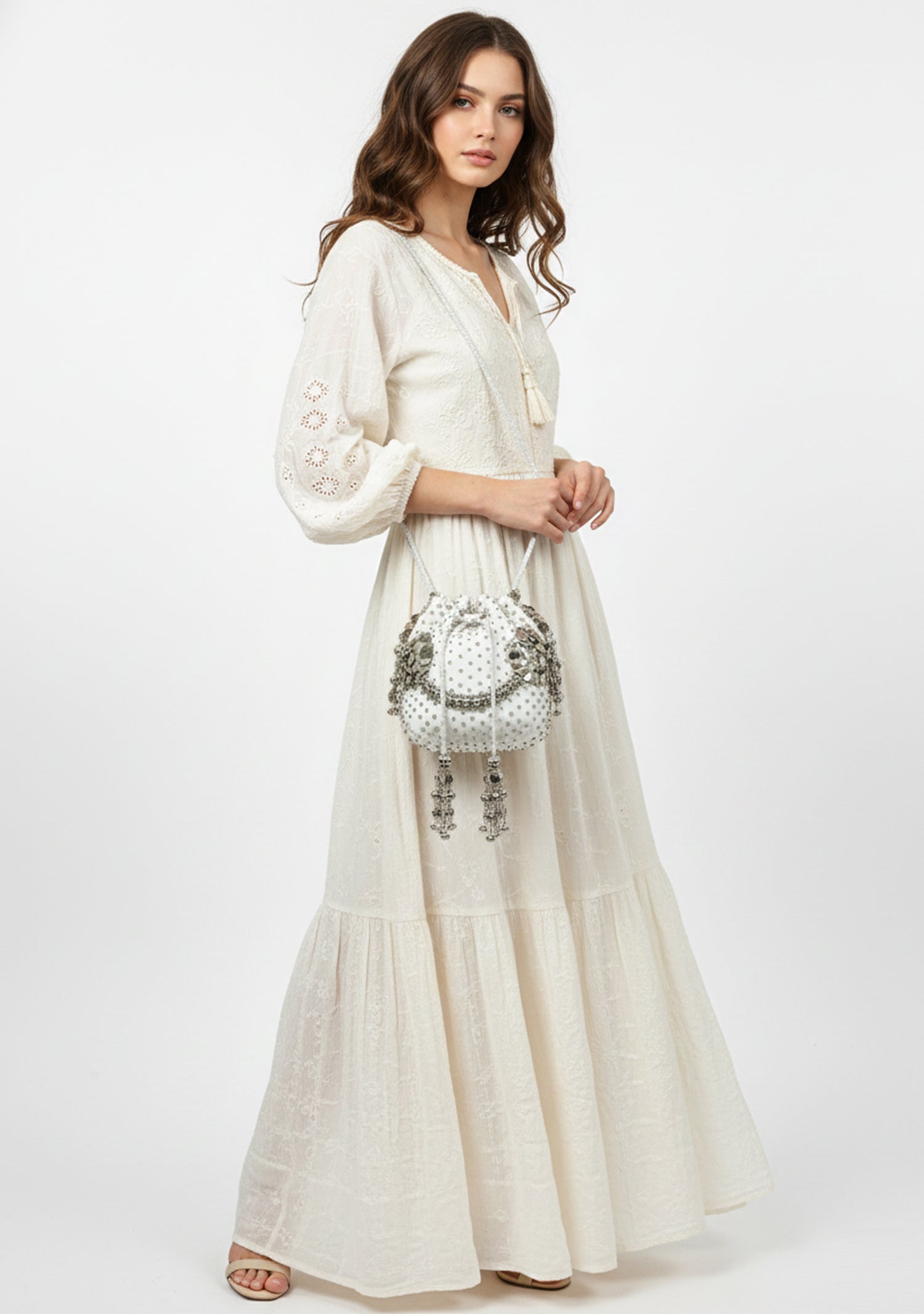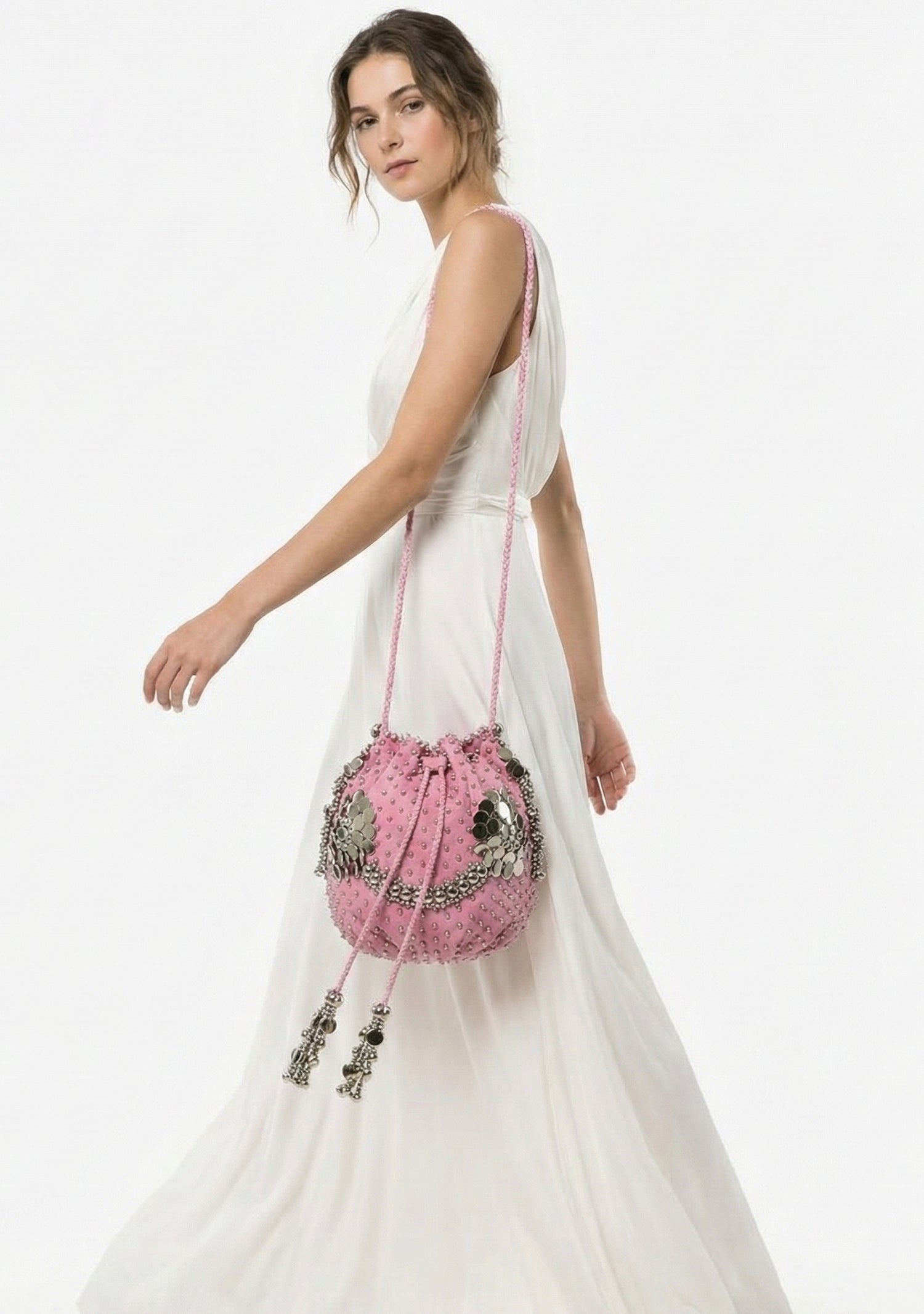 Add a touch of modern elegance to your festive and evening looks with this beautifully handcrafted denim potli bag. Designed in a soft powder-blue hue, the bag is richly adorned with metallic beads, mirror accents, and silver-tone embellishments that create a luxurious, statement-making texture.