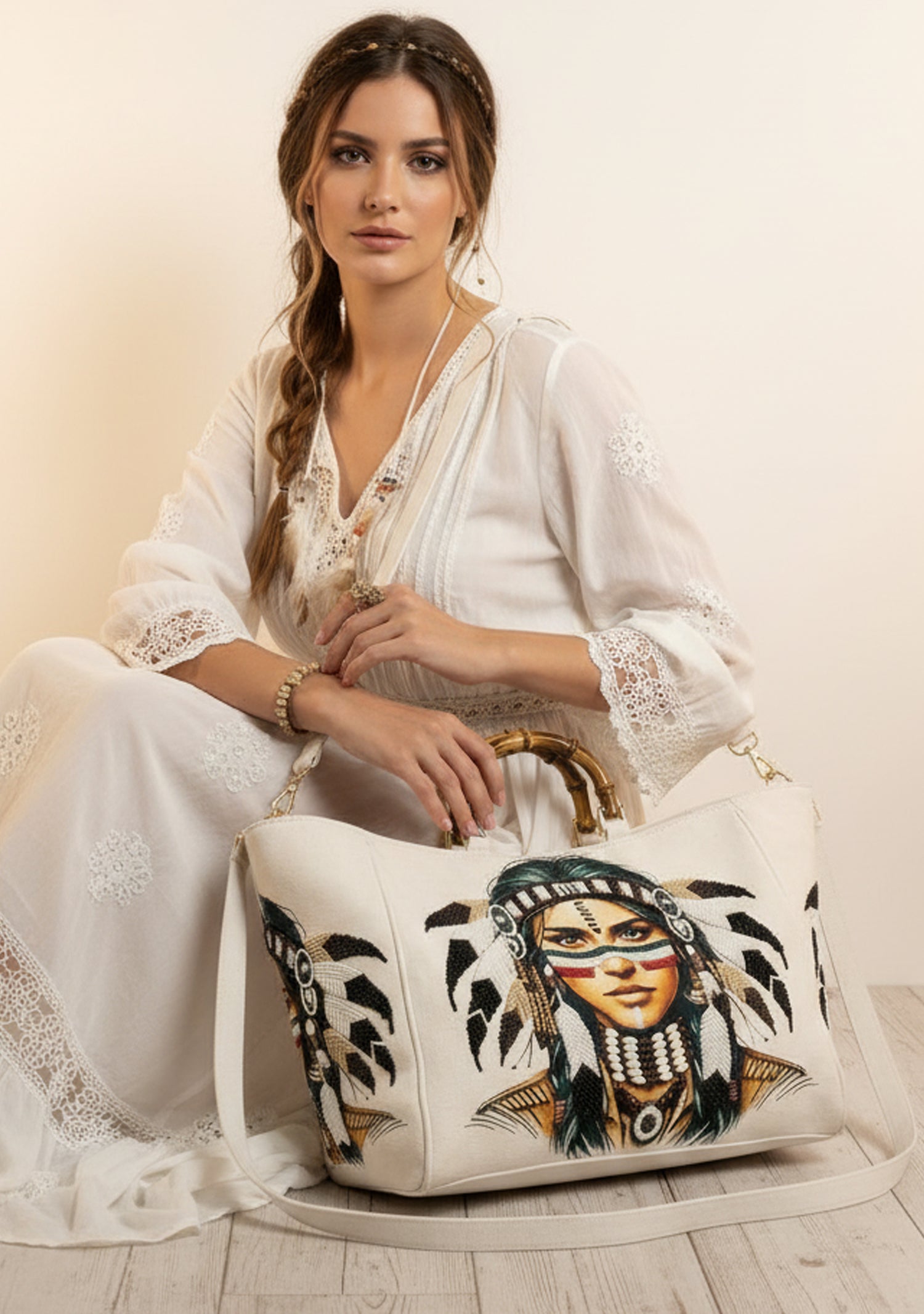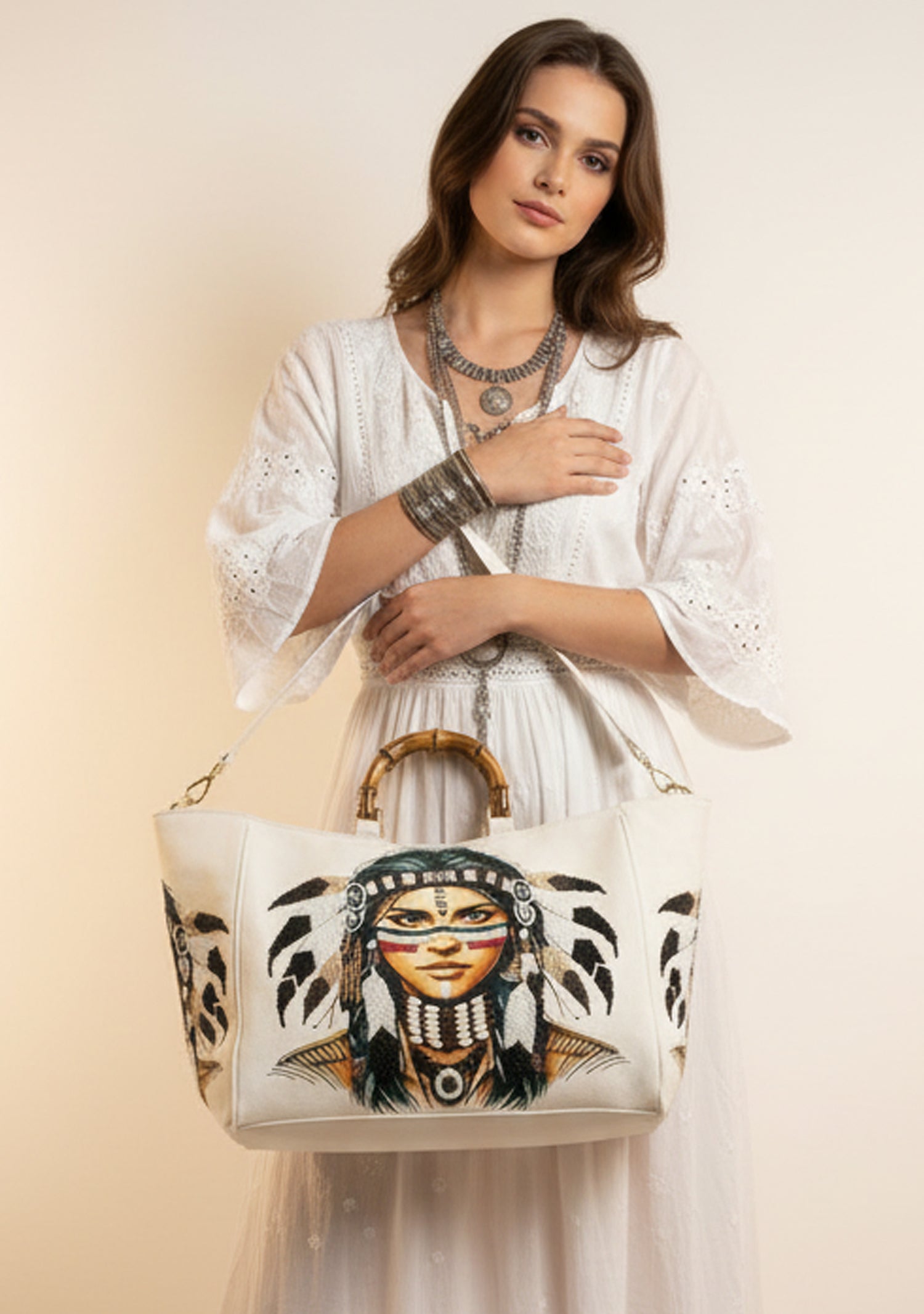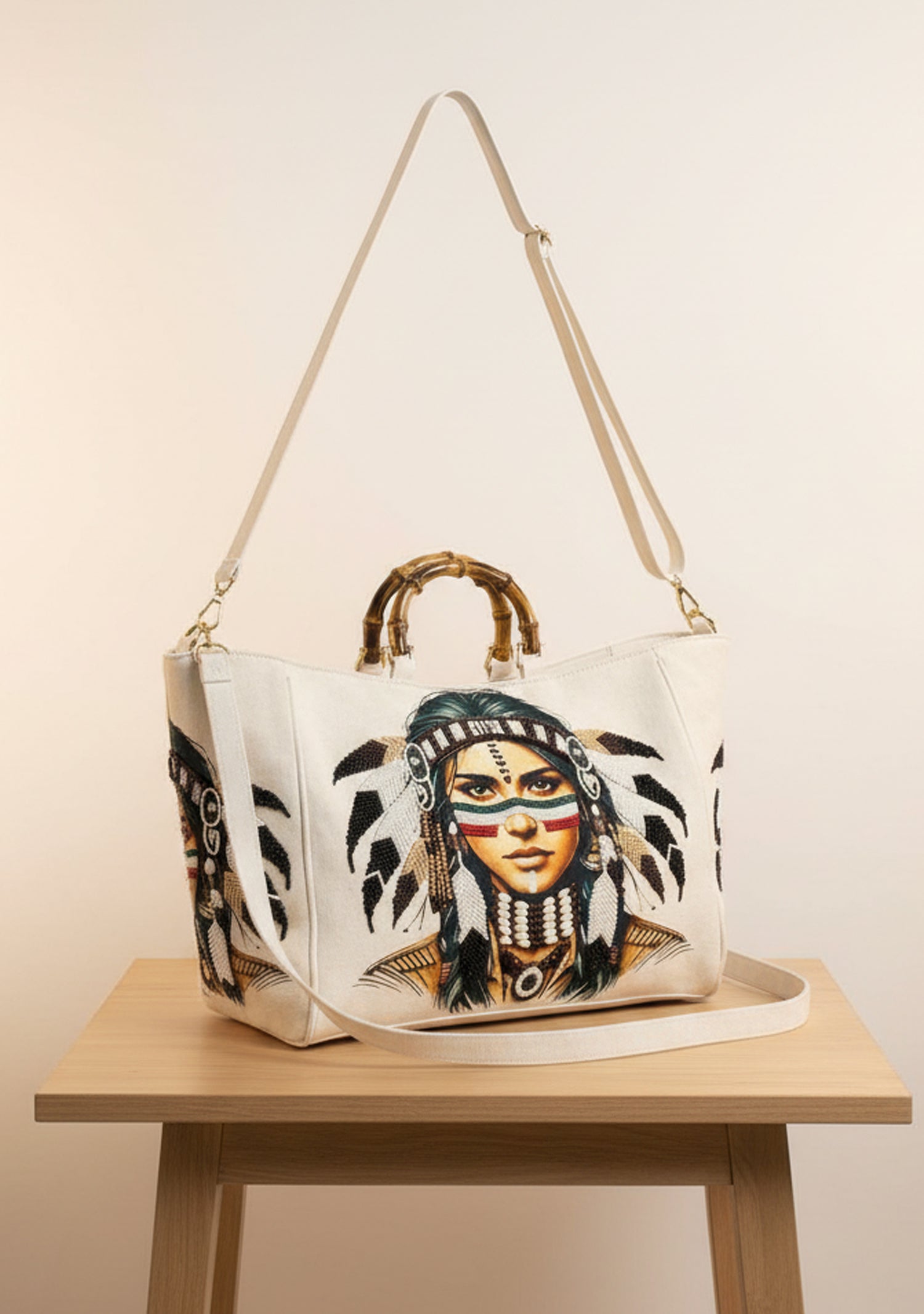 Turn heads with this exquisite Premium Heavy Hand-Embroidered Tote Bag, beautifully crafted with an artistic portrait motif and rich thread detailing. Designed on an elegant ivory canvas base, the bag features intricate hand embroidery, textured accents, and stylish bamboo handles.