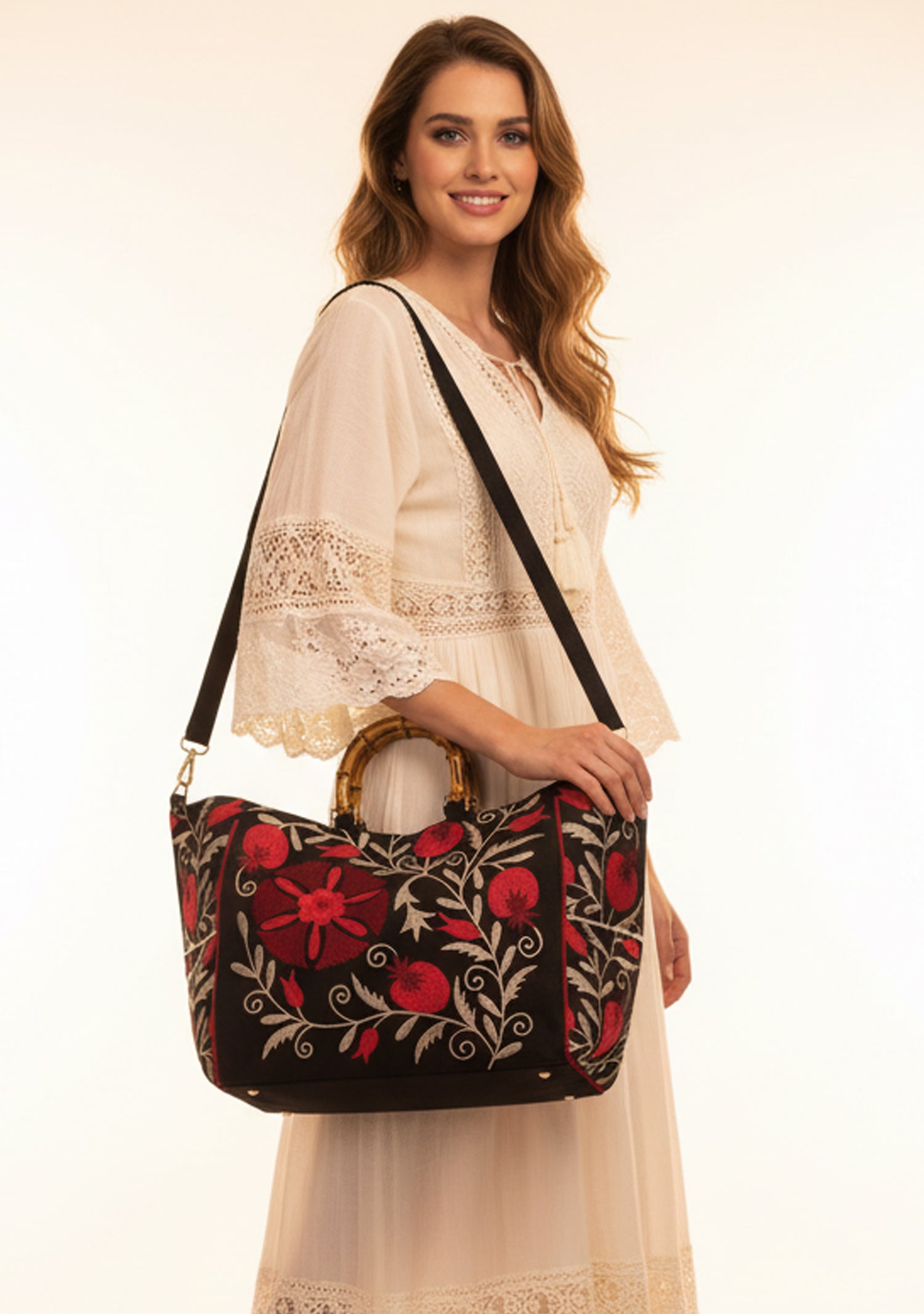 • Luxurious embroidered floral pattern in red and gold