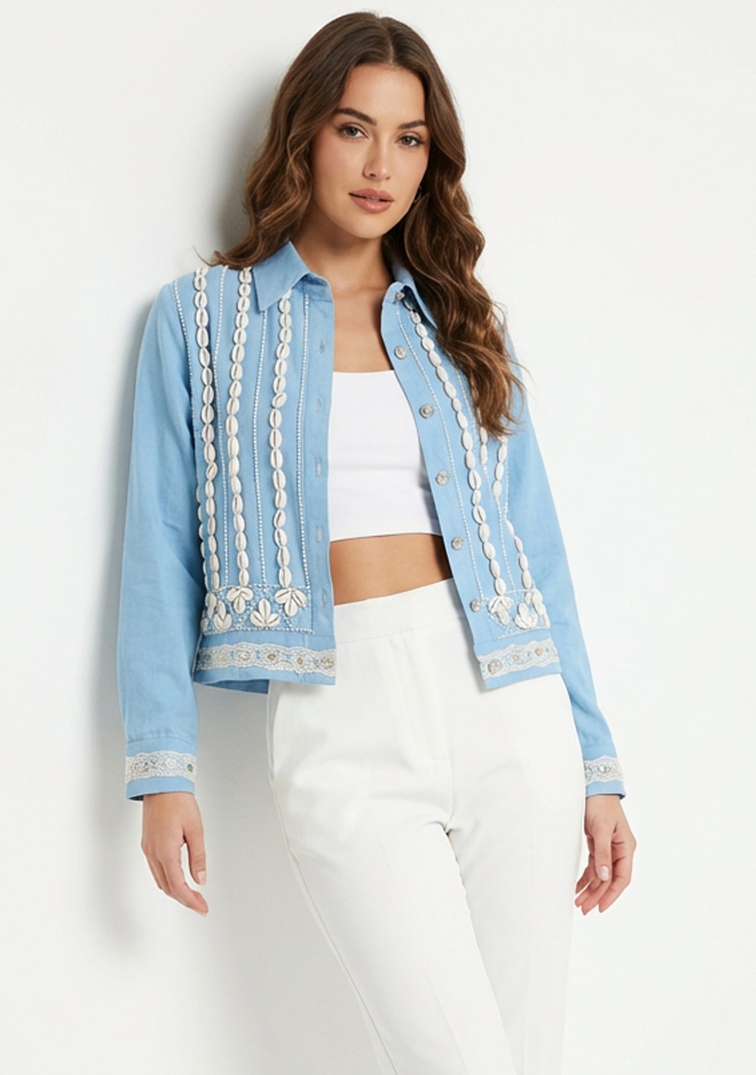 These jackets exhibit a bold fusion of Kodi work and intricate bead embroidery, bringing a traditional yet contemporary feel. The Kodi embroidery, known for its raised, textured patterns, forms ornate designs across the jacket, adding depth and dimension.