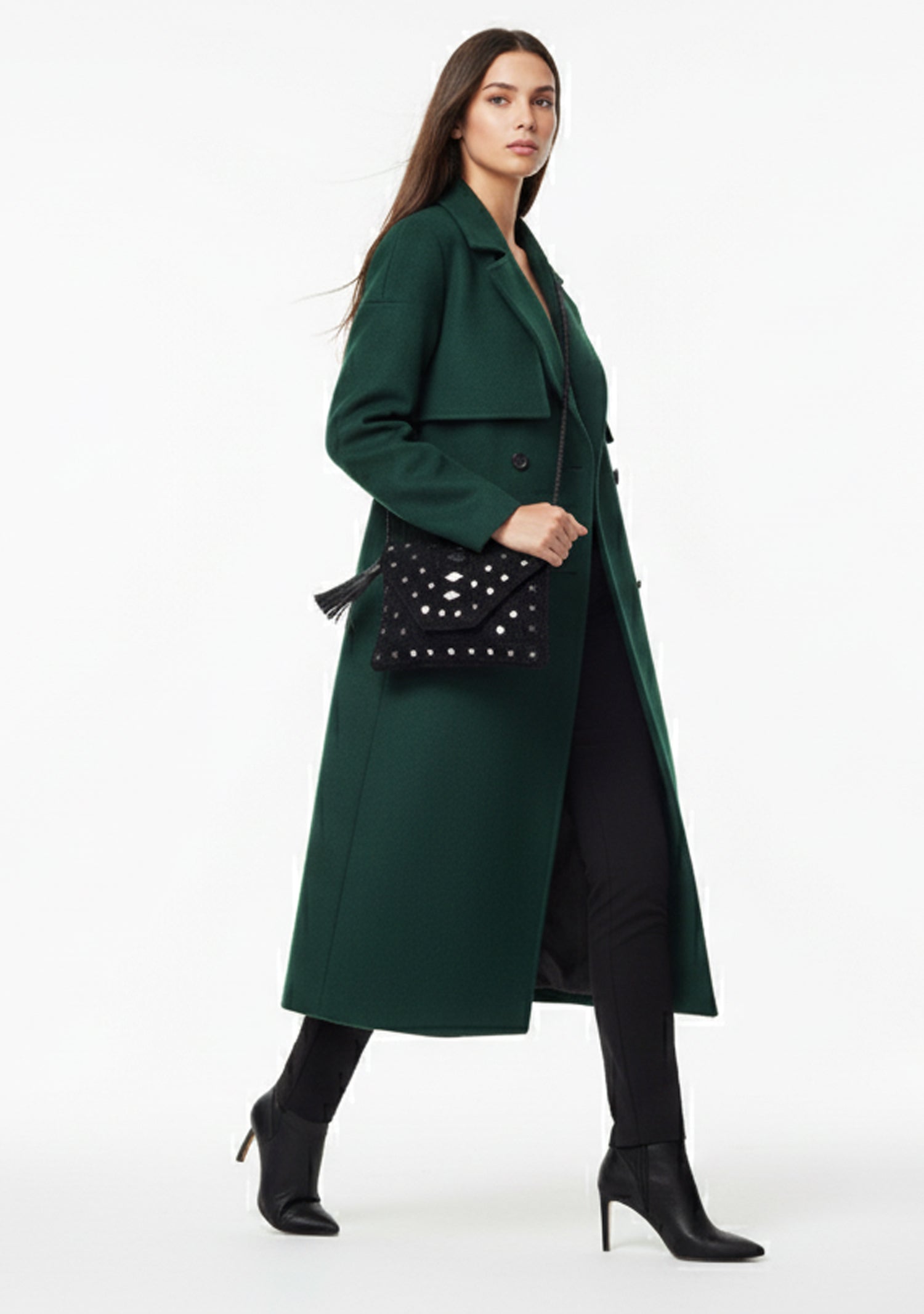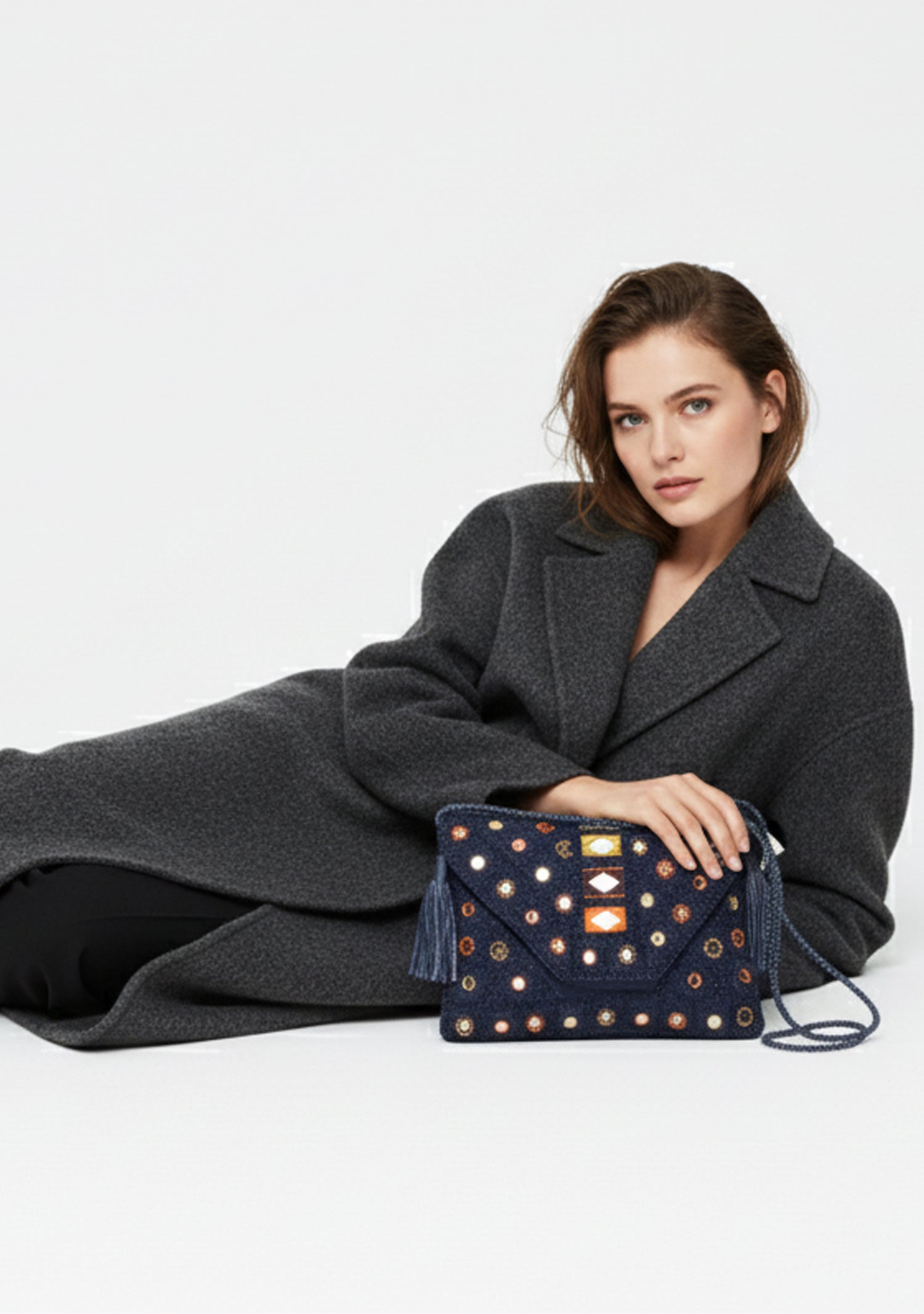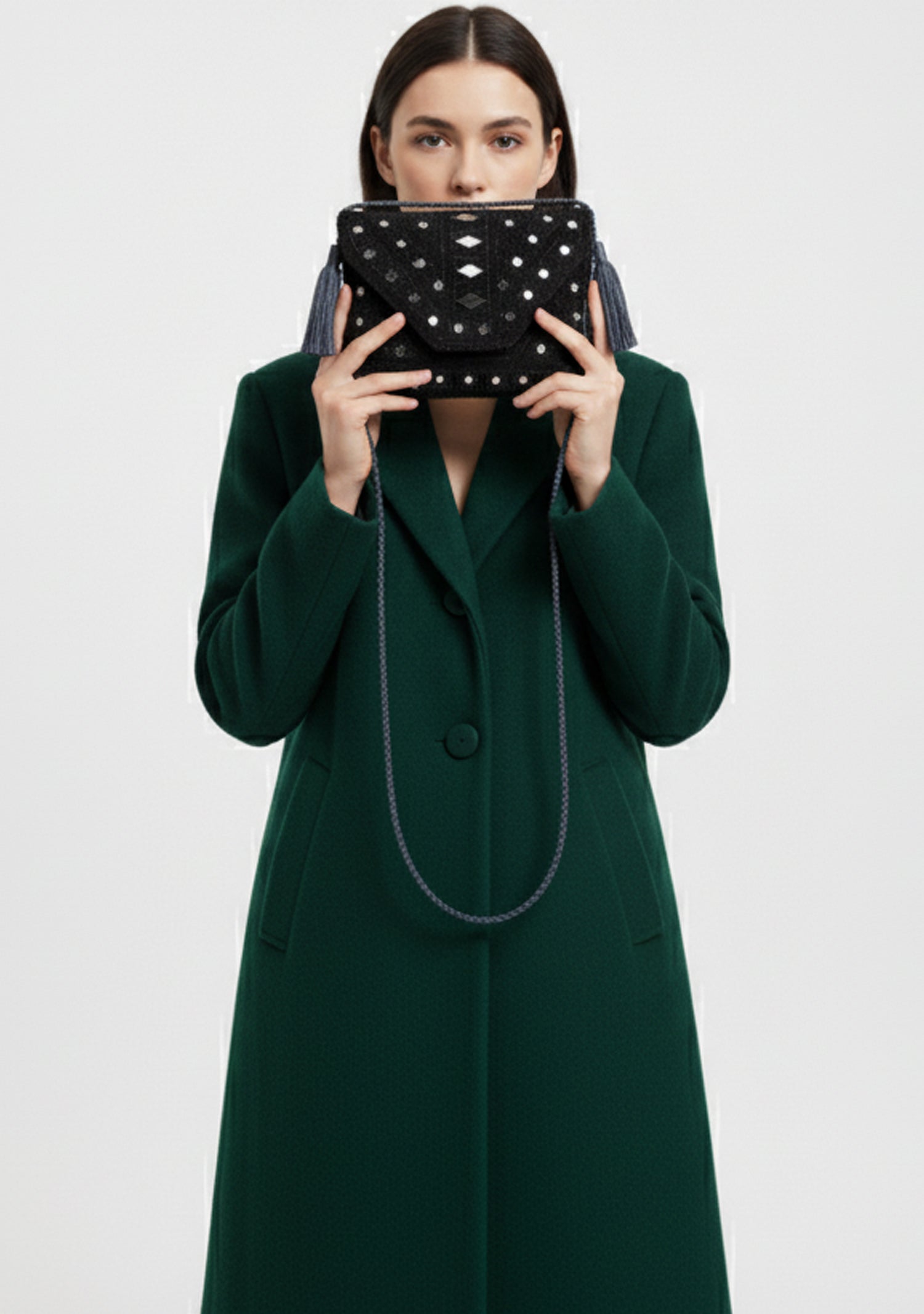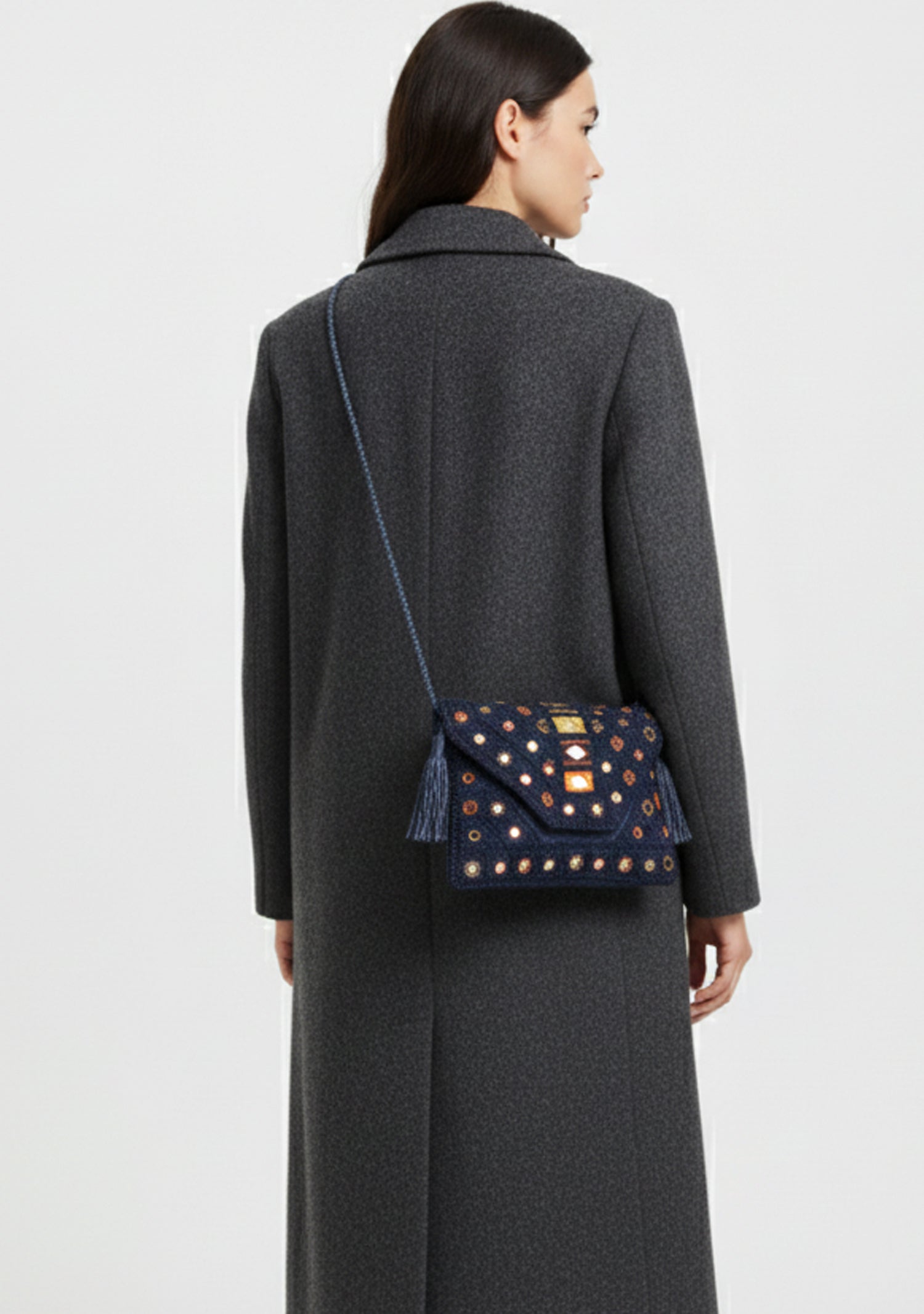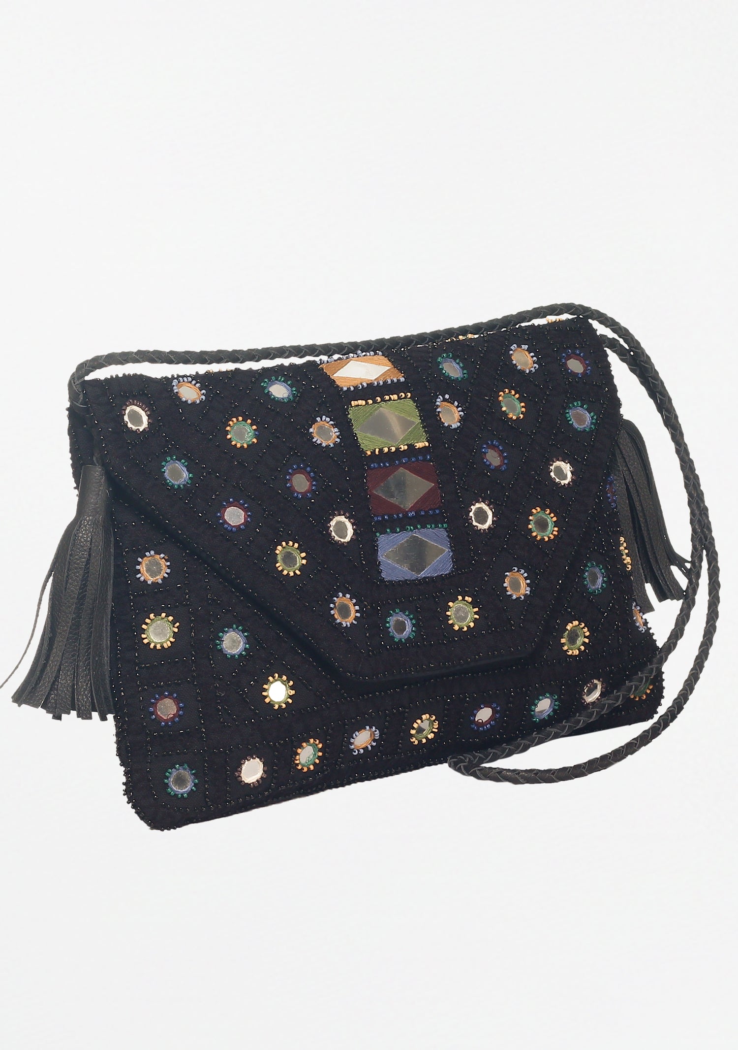 Details: Decorative tassels, silver & black geometric stud design