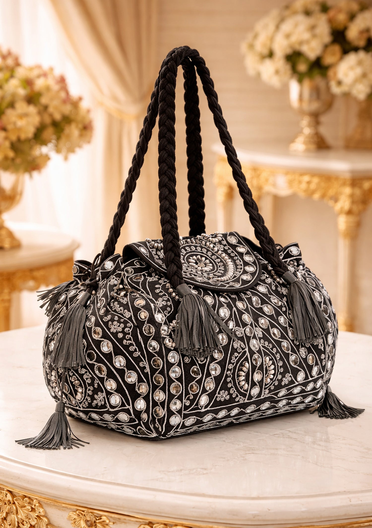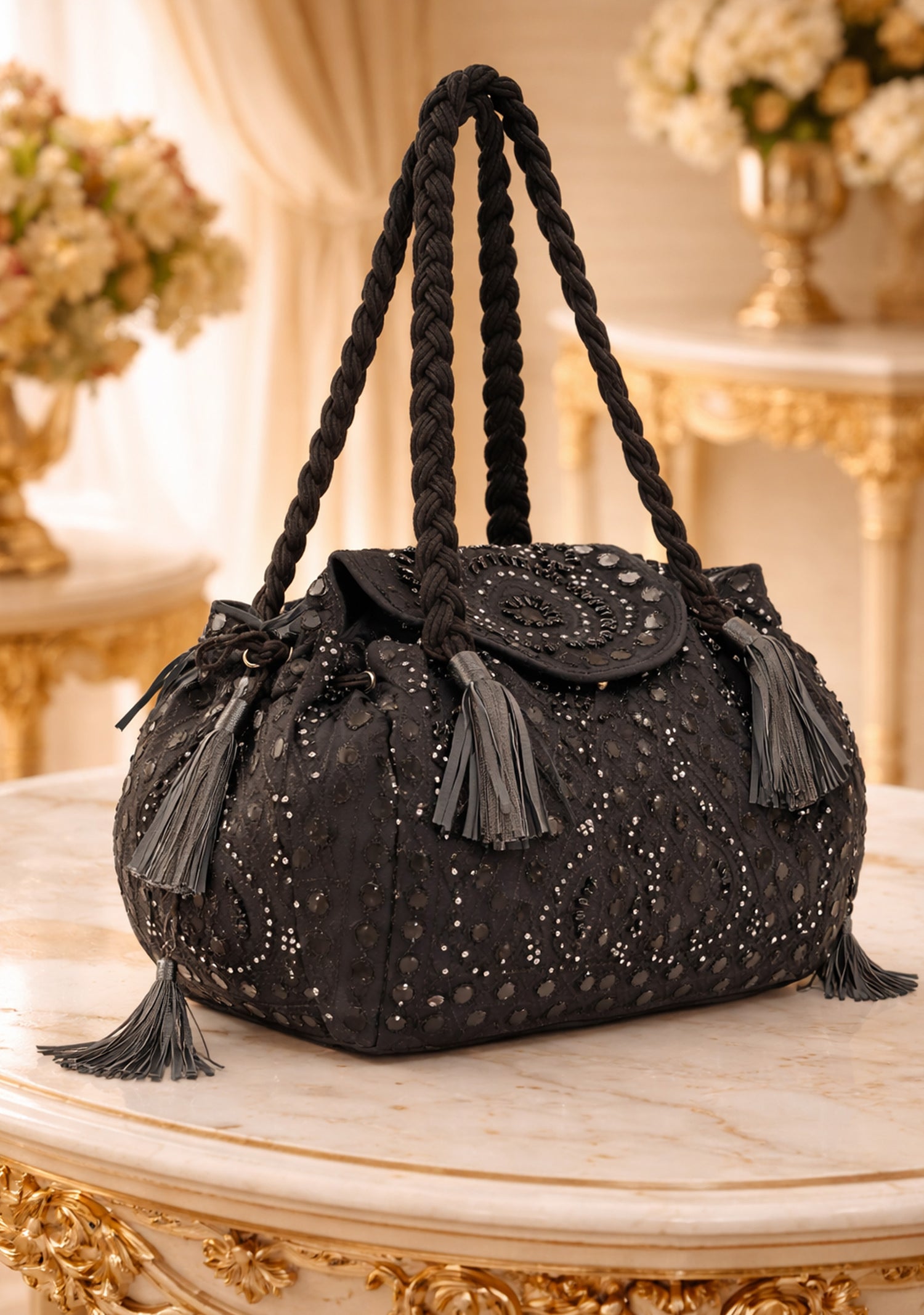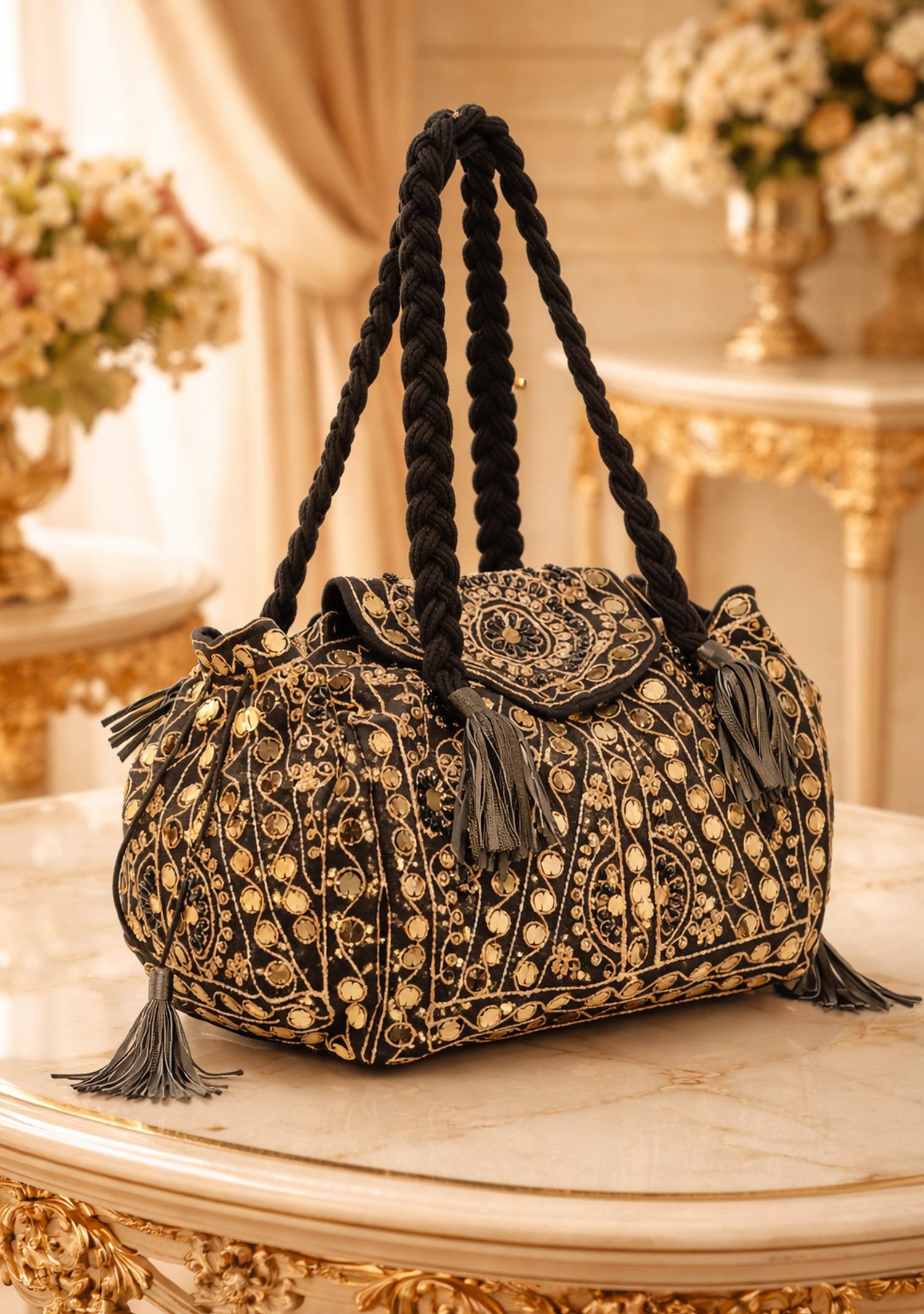 Crafted embroidered velvet potli handbag. Designed on a rich velvet base, the bag is adorned with intricate gold-toned embroidery and sequin detailing that creates a regal, handcrafted appeal. The soft, structured silhouette is complemented by braided fabric handles and delicate tassel accents, offering both comfort and style.