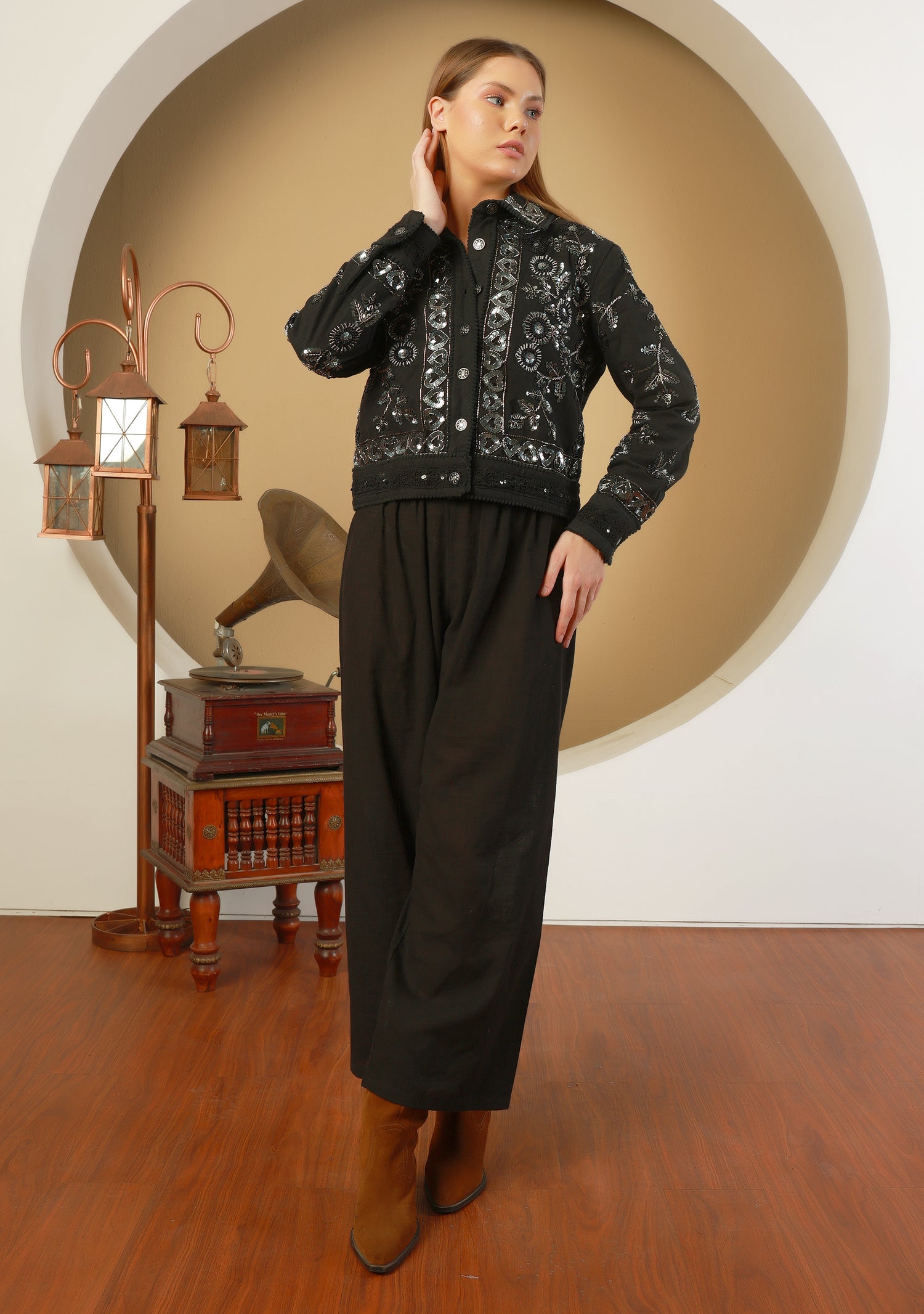 Sparkling beadwork and sequins are artfully integrated into the embroidery, enhancing the jacket's luxurious appeal. These embellishments catch the light beautifully, adding a glamorous touch to your outfit.