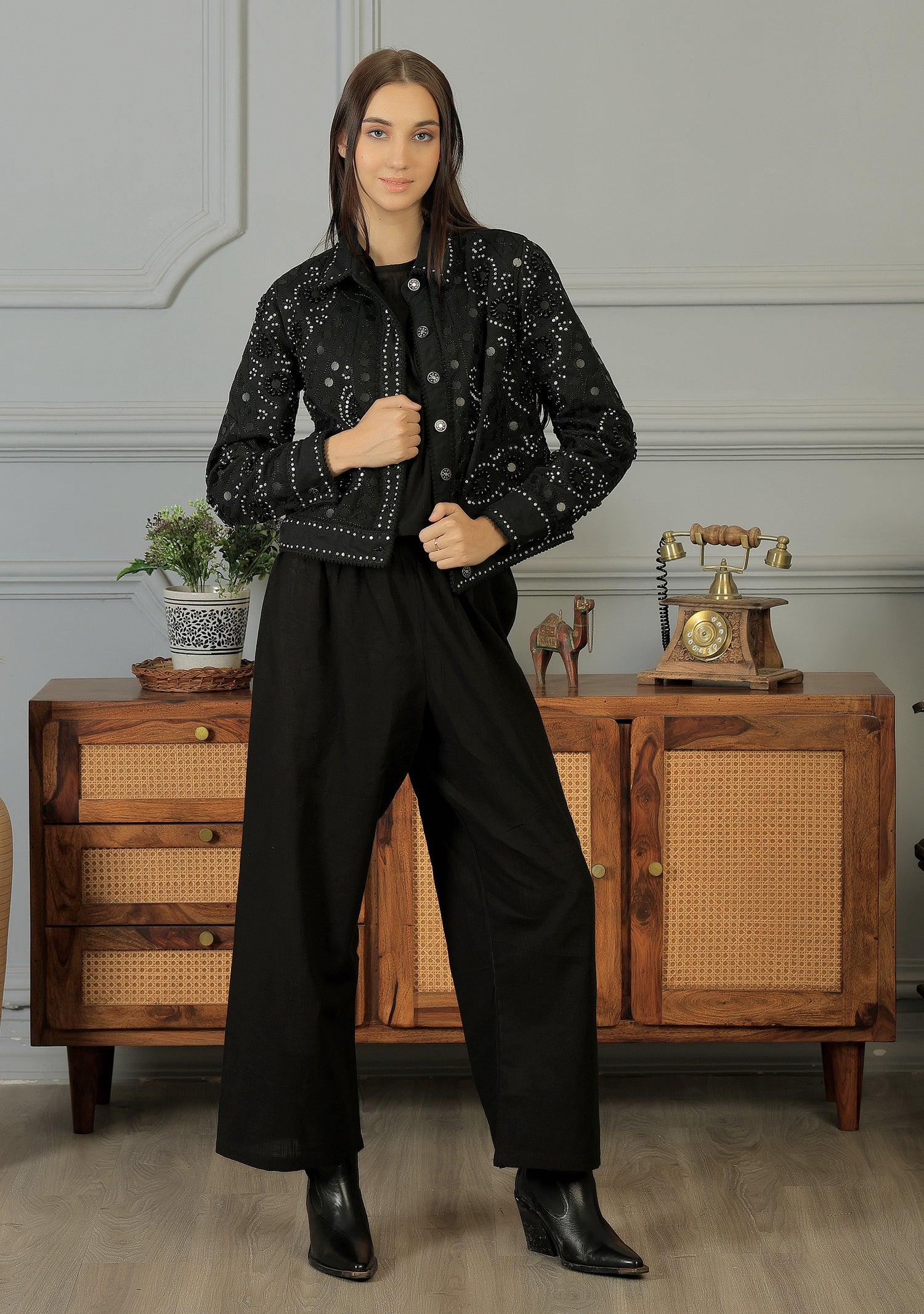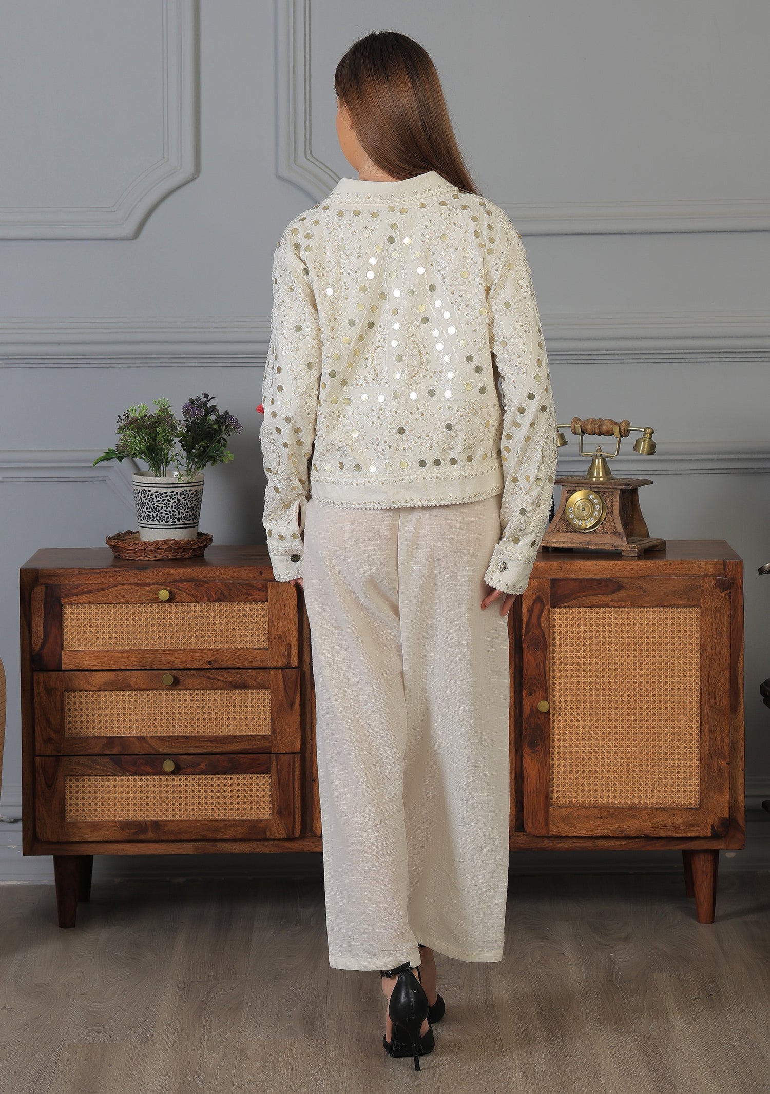 A jacket crafted from 100% poly Georgette with a liner made of 100% cotton, embellished with hand embroidery, epitomizes elegance and artisanal craftsmanship. Poly Georgette lends the jacket a lightweight and flowing quality, making it ideal for layering over different outfits while maintaining a graceful silhouette.