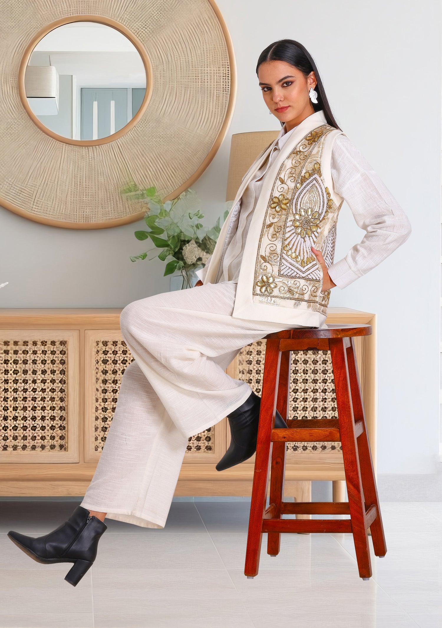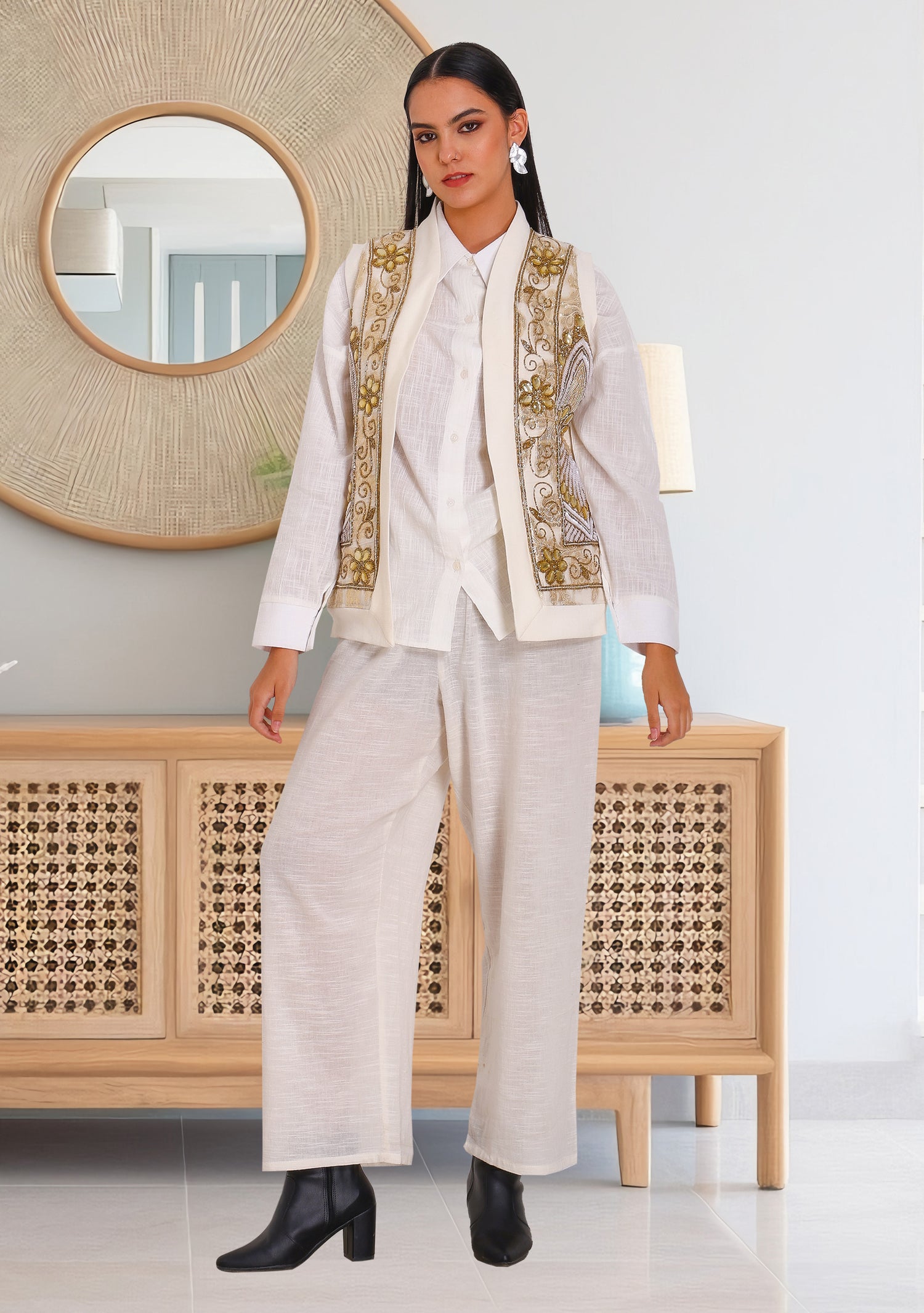 Elevate your ensemble with this striking black vest, exquisitely hand-embroidered with intricate gold and white threadwork. Featuring rich baroque patterns and statement motifs, this vest is designed to turn heads at any event.